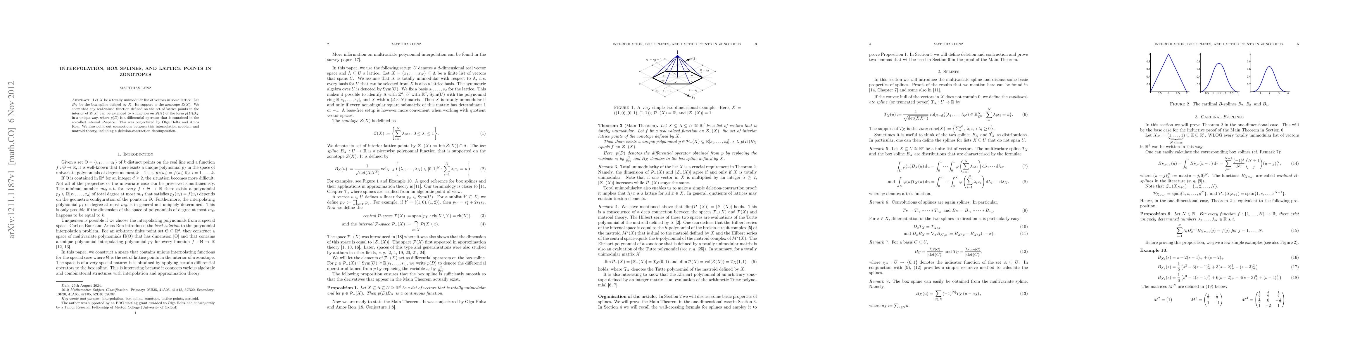 Let $X$ be a totally unimodular list of vectors in some lattice. Let $B_X$ be the box spline defined by $X$. Its support is the zonotope $Z(X)$. We show that any real-valued function defined on the set of lattice points in the interior of $Z(X)$ can be extended to a function on $Z(X)$ of the form $p(D)B_X$ in a unique way, where $p(D)$ is a differential operator that is contained in the so-called internal $\Pcal$-space. This was conjectured by Olga Holtz and Amos Ron. We also point out connections between this interpolation problem and matroid theory, including a deletion-contraction decomposition.