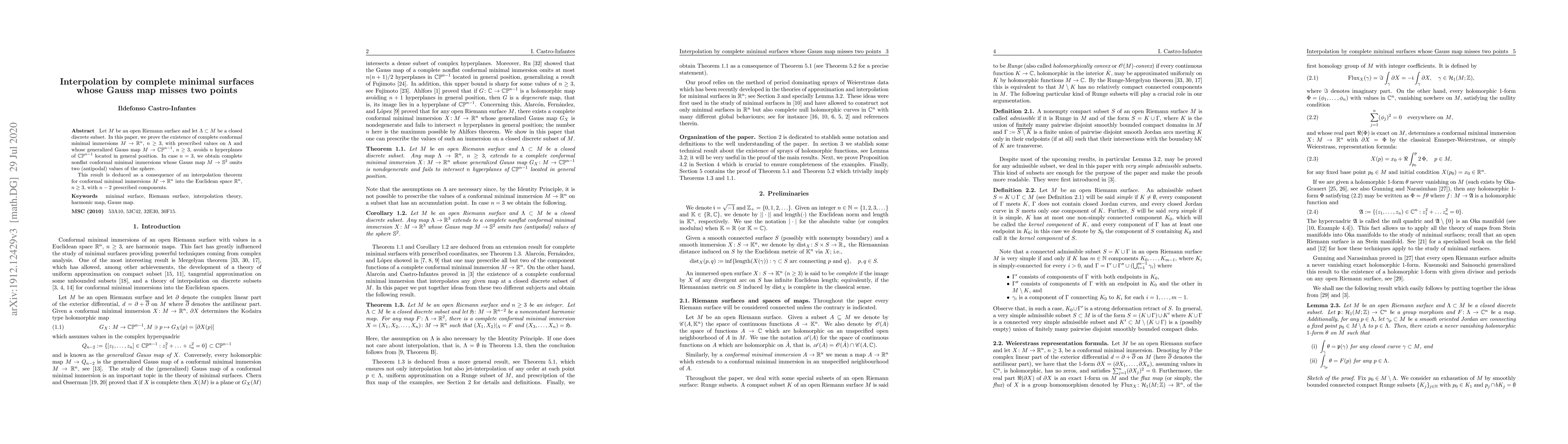 This paper proves the existence of complete minimal surfaces in $\mathbb{R}^n$ that interpolate specified points on a Riemann surface while avoiding prescribed hyperplanes in $\mathbb{CP}^{n-1}$. For $n=3$, it specifically finds nonflat minimal surfaces whose Gauss map omits two antipodal points.