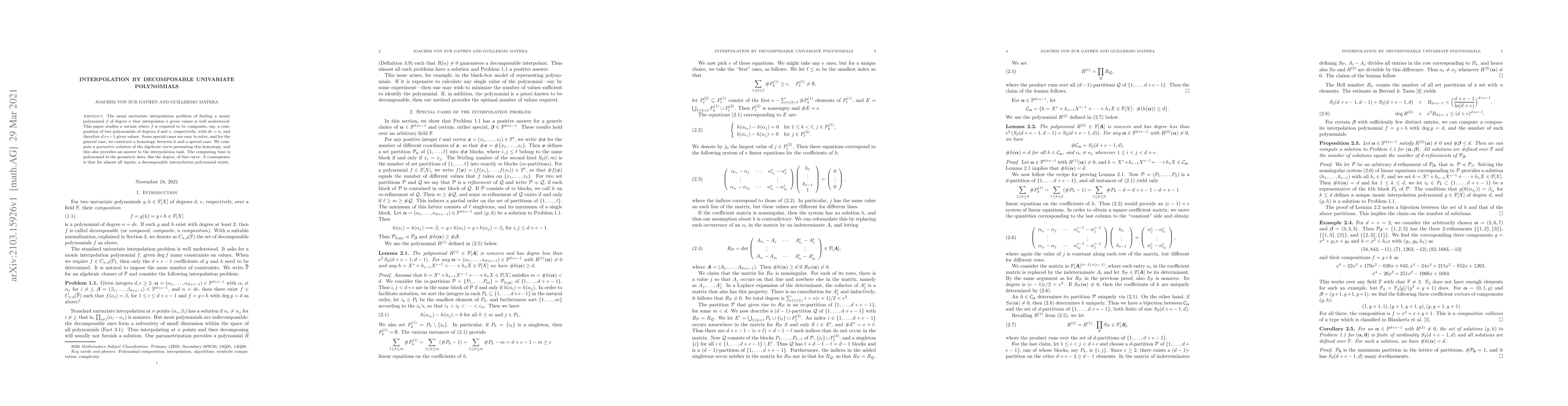 The usual univariate interpolation problem of finding a monic polynomial f of degree n that interpolates n given values is well understood. This paper studies a variant where f is required to be composite, say, a composition of two polynomials of degrees d and e, respectively, with de=n, and therefore d+e-1 given values. Some special cases are easy to solve, and for the general case, we construct a homotopy between it and a special case. We compute a geometric solution of the algebraic curve presenting this homotopy, and this also provides an answer to the interpolation task. The computing time is polynomial in the geometric data, like the degree, of this curve. A consequence is that for almost all inputs, a decomposable interpolation polynomial exists.
