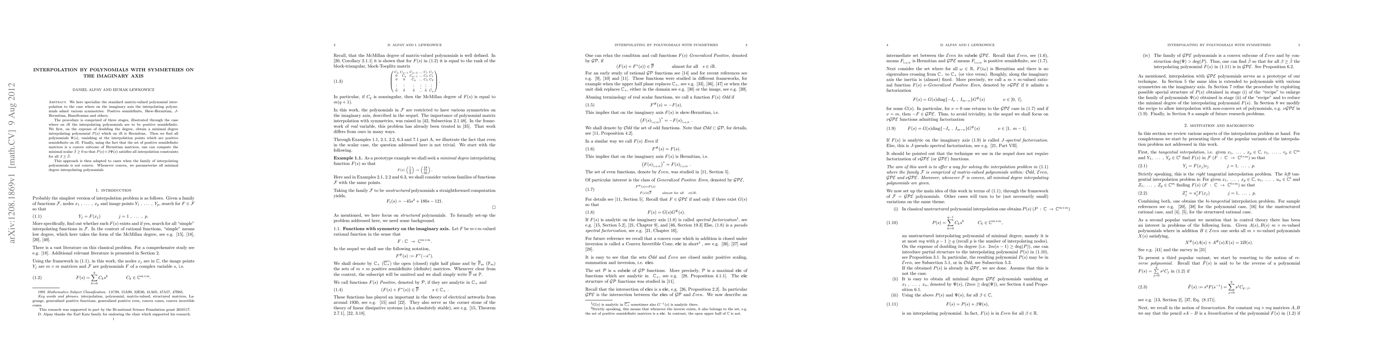 We here specialize the standard matrix-valued polynomial interpolation to the case where on the imaginary axis the interpolating polynomials admit various symmetries: Positive semidefinite, Skew-Hermitian, $J$-Hermitian, Hamiltonian and others. The procedure is comprized of three stages, illustrated through the case where on $i\R$ the interpolating polynomials are to be positive semidefinite. We first, on the expense of doubling the degree, obtain a minimal degree interpolating polynomial $P(s)$ which on $i\R$ is Hermitian. Then we find all polynomials $\Psi(s)$, vanishing at the interpolation points which are positive semidefinite on $i\R$. Finally, using the fact that the set of positive semidefinite matrices is a convex subcone of Hermitian matrices, one can compute the minimal scalar $\hat{\beta}\geq 0$ so that $P(s)+\beta\Psi(s)$ satisfies all interpolation constraints for all $\beta\geq\hat{\beta}$. This approach is then adapted to cases when the family of interpolating polynomials is not convex. Whenever convex, we parameterize all minimal degree interpolating polynomials.