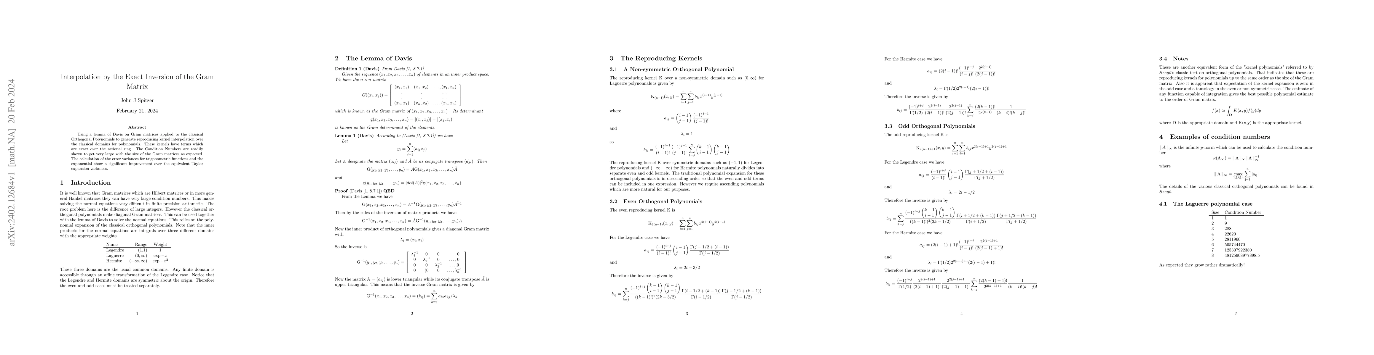 Using a lemma of Davis on Gram matrices applied to the classical Orthogonal Polynomials to generate reproducing kernel interpolation over the classical domains for polynomials. These kernels have terms which are exact over the rational ring. The Condition Numbers are readily shown to get very large with the size of the Gram matrices as expected. The calculation of the error variances for trigonometric functions and the exponential show a significant improvement over the equivalent Taylor expansion variances.