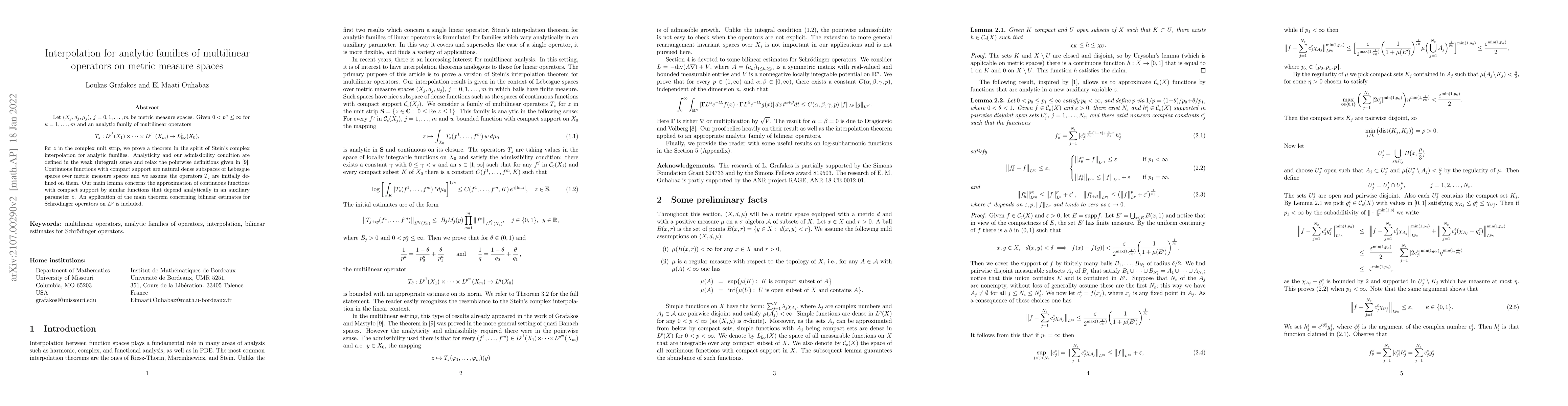 This paper proves a complex interpolation theorem for analytic families of multilinear operators defined on metric measure spaces, relaxing pointwise definitions and using continuous functions with compact support. The result includes applications to bilinear estimates for Schrödinger operators on Lp spaces.