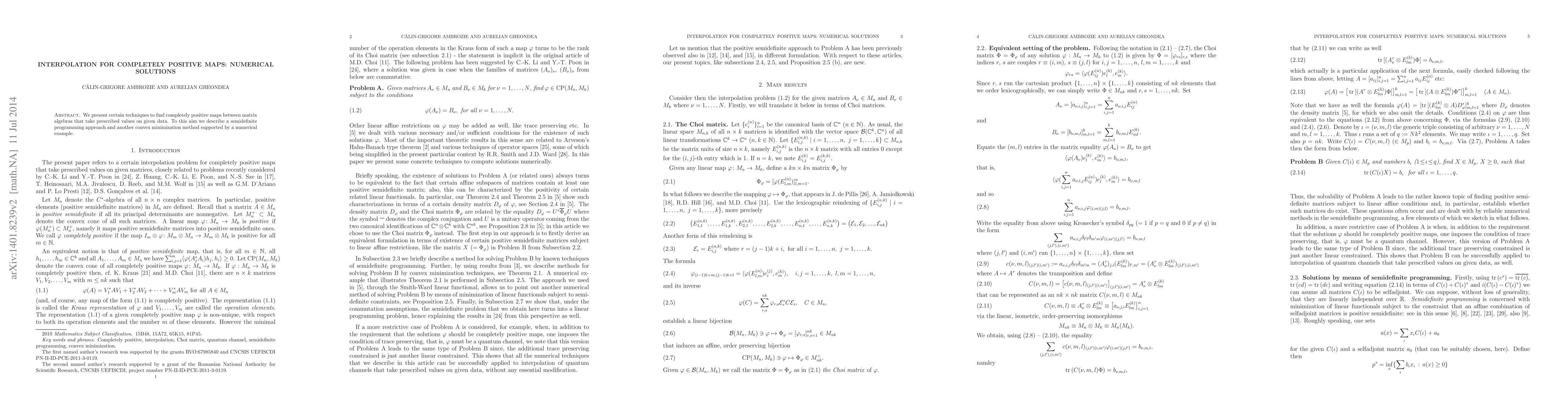 We present certain techniques to find completely positive maps between matrix algebras that take prescribed values on given data. To this aim we describe a semidefinite programming approach and another convex minimization method supported by a numerical example.