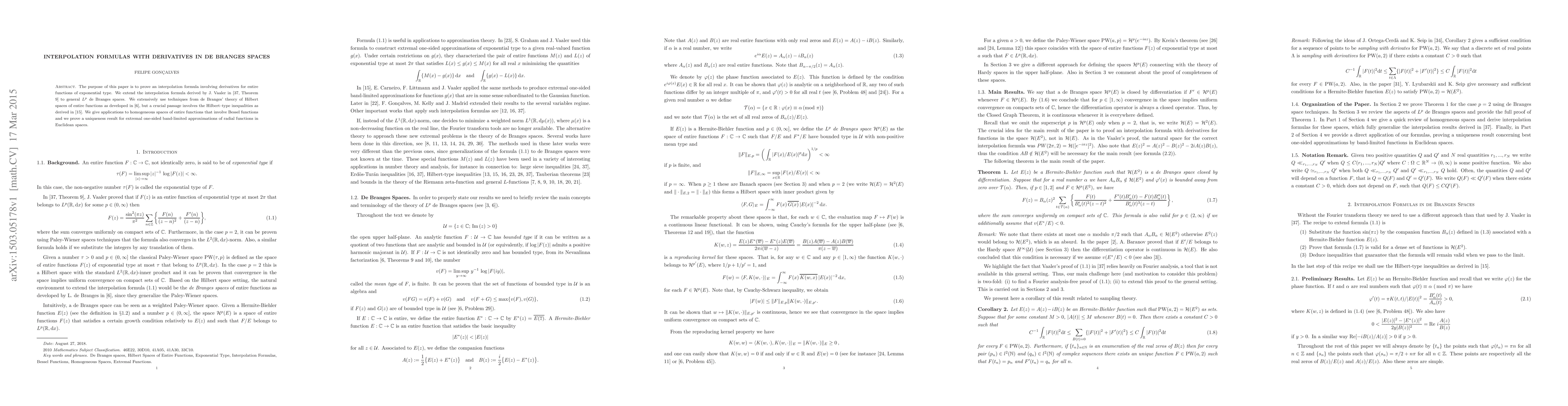 This paper proves an interpolation formula with derivatives for entire functions in $L^p$ de Branges spaces, extending Vaaler's theorem. It applies de Branges' theory and Hilbert-type inequalities, providing applications to Bessel functions and a uniqueness result for band-limited approximations.