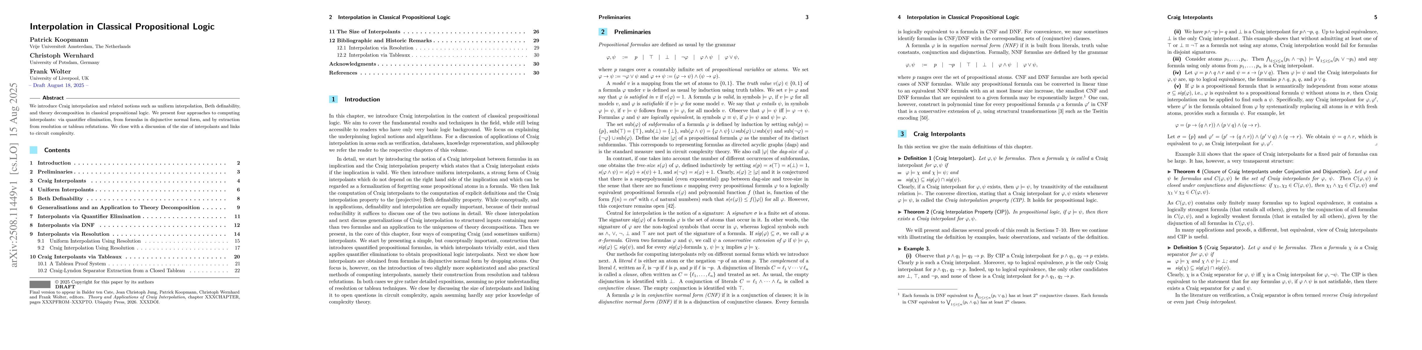 We introduce Craig interpolation and related notions such as uniform interpolation, Beth definability, and theory decomposition in classical propositional logic. We present four approaches to computing interpolants: via quantifier elimination, from formulas in disjunctive normal form, and by extraction from resolution or tableau refutations. We close with a discussion of the size of interpolants and links to circuit complexity.