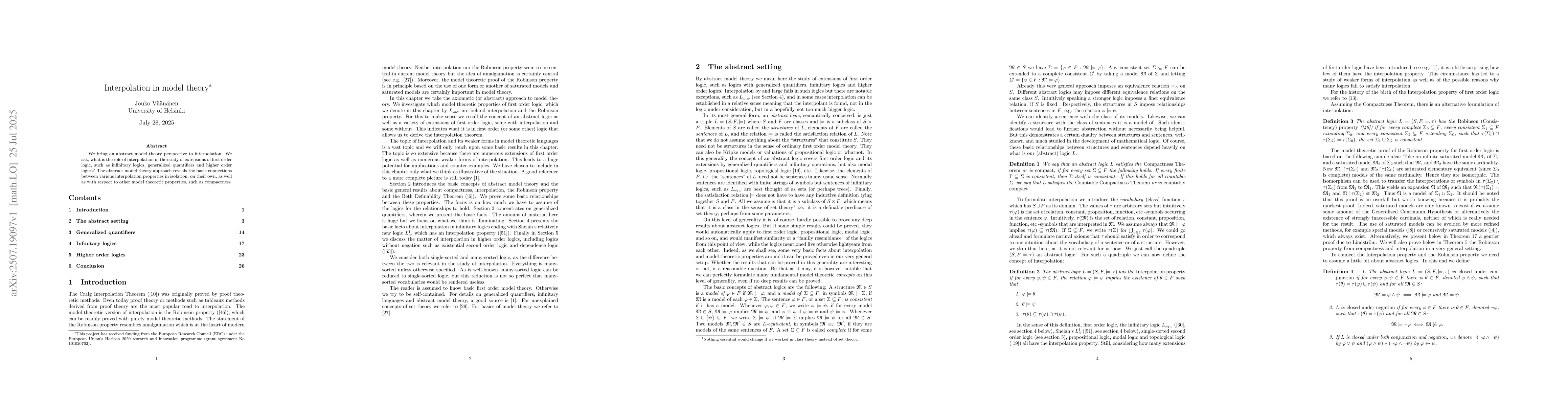 We bring an abstract model theory perspective to interpolation. We ask, what is the role of interpolation in the study of extensions of first order logic, such as infinitary logics, generalized quantifiers and higher order logics? The abstract model theory approach reveals the basic connections between various interpolation properties in isolation, on their own, as well as with respect to other model theoretic properties, such as compactness.