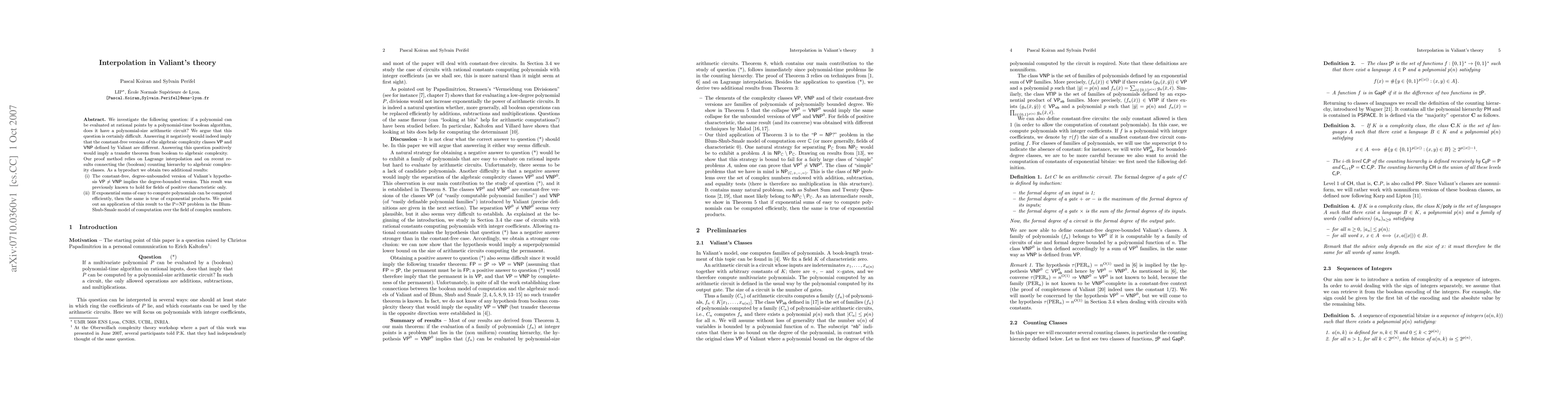 This paper explores the relationship between polynomial evaluation at rational points and the existence of polynomial-size arithmetic circuits, arguing that a negative answer would distinguish Valiant's VP and VNP classes, while a positive answer would imply a transfer theorem from boolean to algebraic complexity. The study leverages Lagrange interpolation and connections between the counting hierarchy and algebraic complexity classes.