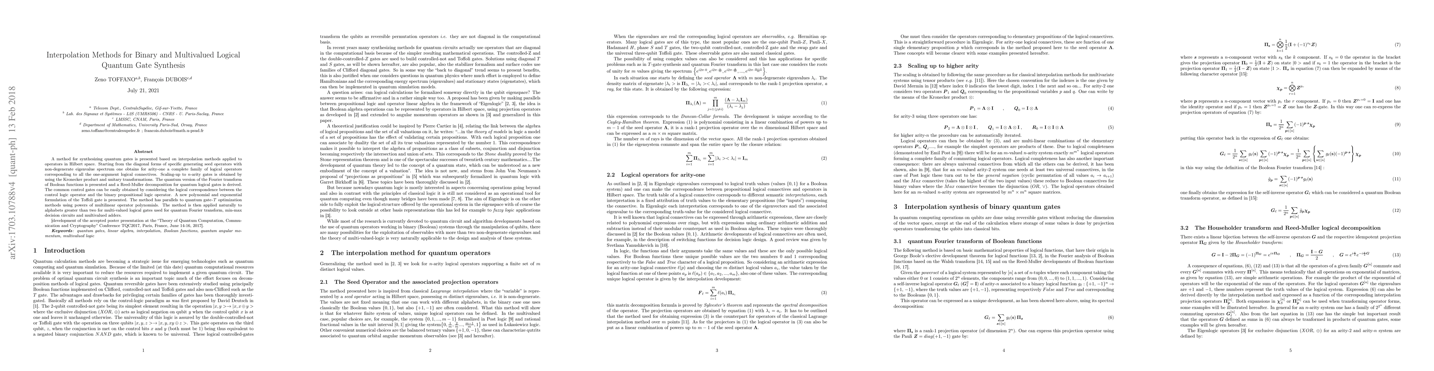 A method for synthesizing quantum gates is presented based on interpolation methods applied to operators in Hilbert space. Starting from the diagonal forms of specific generating seed operators with non-degenerate eigenvalue spectrum one obtains for arity-one a complete family of logical operators corresponding to all the one-argument logical connectives. Scaling-up to n-arity gates is obtained by using the Kronecker product and unitary transformations. The quantum version of the Fourier transform of Boolean functions is presented and a Reed-Muller decomposition for quantum logical gates is derived. The common control gates can be easily obtained by considering the logical correspondence between the control logic operator and the binary propositional logic operator. A new polynomial and exponential formulation of the Toffoli gate is presented. The method has parallels to quantum gate-T optimization methods using powers of multilinear operator polynomials. The method is then applied naturally to alphabets greater than two for multi-valued logical gates used for quantum Fourier transform, min-max decision circuits and multivalued adders.