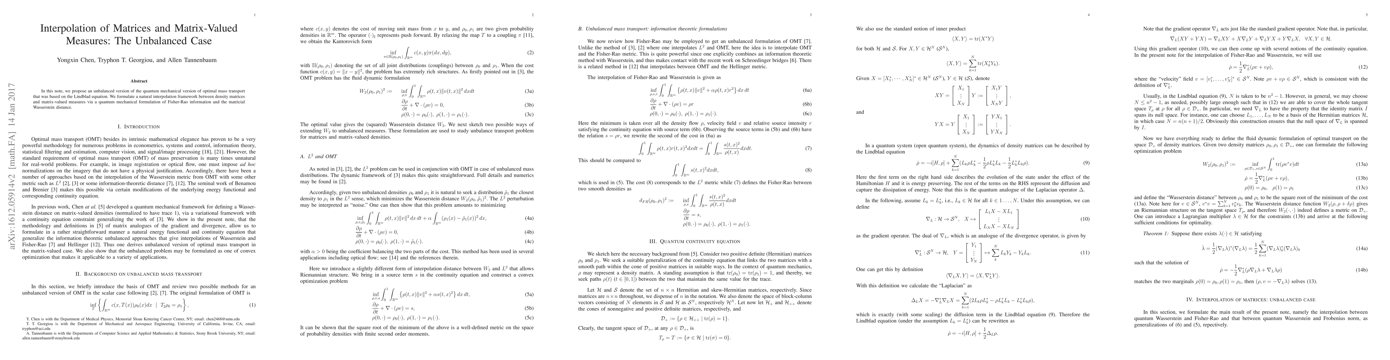 In this note, we propose an unbalanced version of the quantum mechanical version of optimal mass transport that was based on the Lindblad equation. We formulate a natural interpolation framework between density matrices and matrix-valued measures via a quantum mechanical formulation of Fisher-Rao information and the matricial Wasserstein distance.