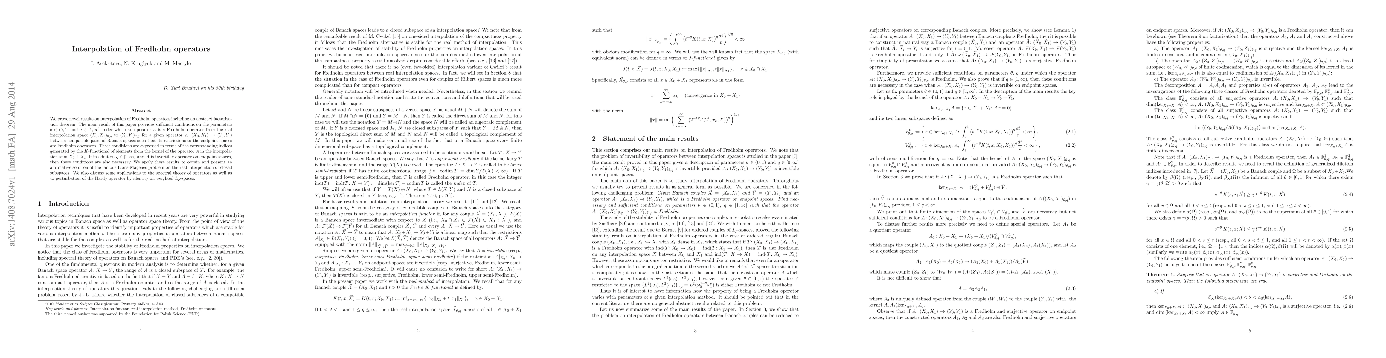 This paper establishes sufficient and necessary conditions for Fredholm operators to belong to real interpolation spaces, proving an abstract factorization theorem. It also resolves the Lions-Magenes problem on the interpolation of closed subspaces and explores applications to spectral theory and perturbation of the Hardy operator.