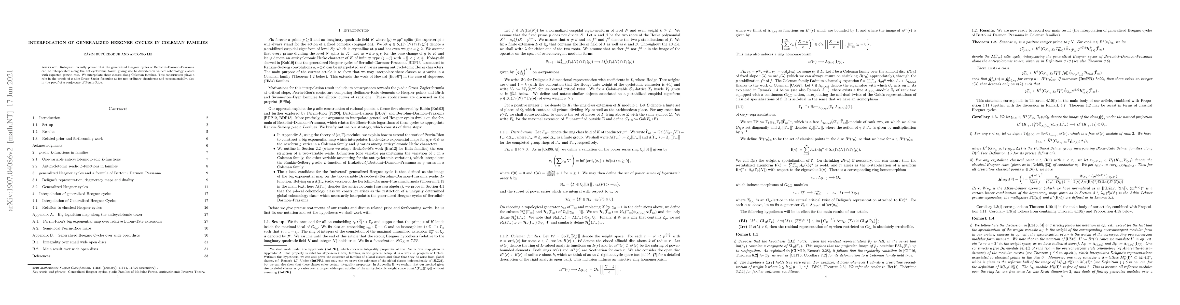 Kobayashi recently proved that the generalized Heegner cycles of Bertolini--Darmon--Prasanna can be interpolated along the anticyclotomic tower, giving rise to distribution valued cohomology classes with expected growth rate. We interpolate these classes along Coleman families. This construction plays a role in the proofs of $p$-adic Gross--Zagier formulae at for non-ordinary eigenforms and consequentially, also in the proof of a conjecture of Perrin-Riou.