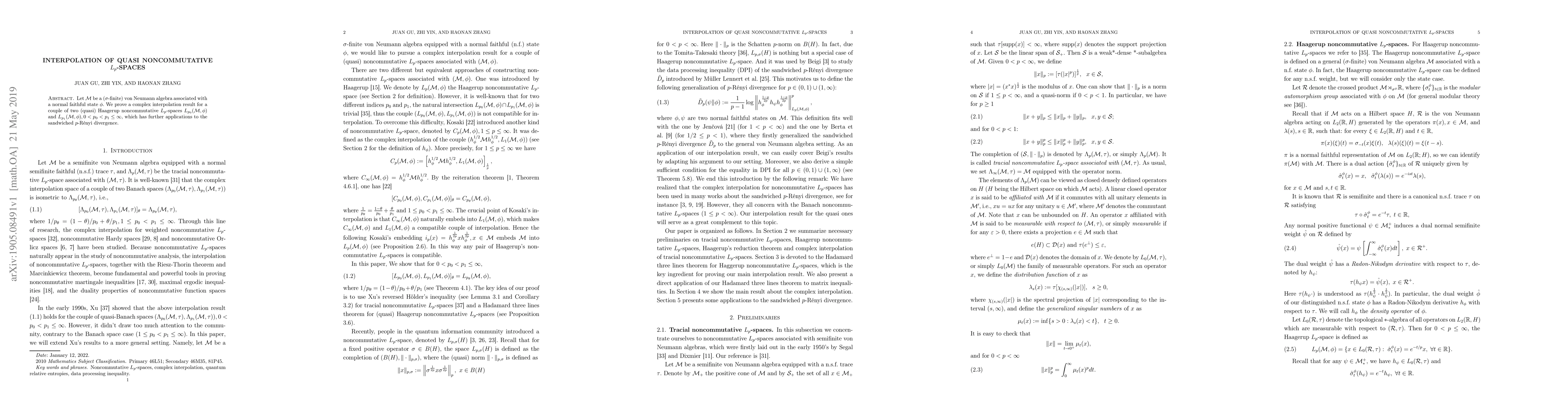 Let $\mathcal{M}$ be a ($\sigma$-finite) von Neumann algebra associated with a normal faithful state $\phi.$ We prove a complex interpolation result for a couple of two (quasi) Haagerup noncommutative $L_p$-spaces $L_{p_0} (\mathcal{M}, \phi)$ and $L_{p_1} (\mathcal{M}, \phi), 0< p_0 < p_1\leq \infty,$ which has further applications to the sandwiched $p$-R\'{e}nyi divergence.