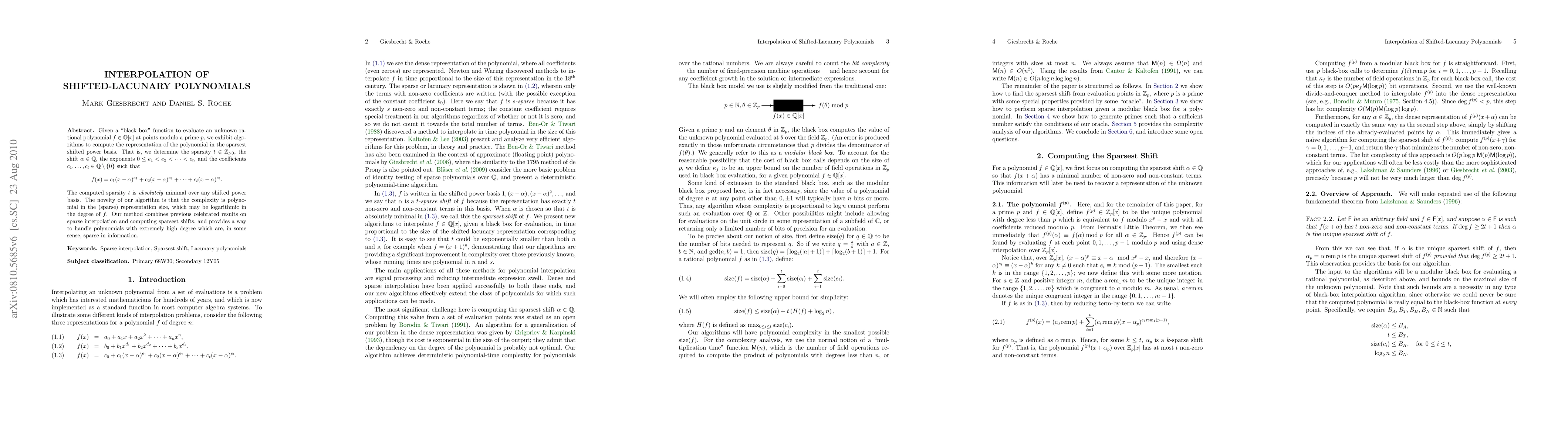 Given a "black box" function to evaluate an unknown rational polynomial f in Q[x] at points modulo a prime p, we exhibit algorithms to compute the representation of the polynomial in the sparsest shifted power basis. That is, we determine the sparsity t, the shift s (a rational), the exponents 0 <= e1 < e2 < ... < et, and the coefficients c1,...,ct in Q\{0} such that f(x) = c1(x-s)^e1+c2(x-s)^e2+...+ct(x-s)^et. The computed sparsity t is absolutely minimal over any shifted power basis. The novelty of our algorithm is that the complexity is polynomial in the (sparse) representation size, and in particular is logarithmic in deg(f). Our method combines previous celebrated results on sparse interpolation and computing sparsest shifts, and provides a way to handle polynomials with extremely high degree which are, in some sense, sparse in information.