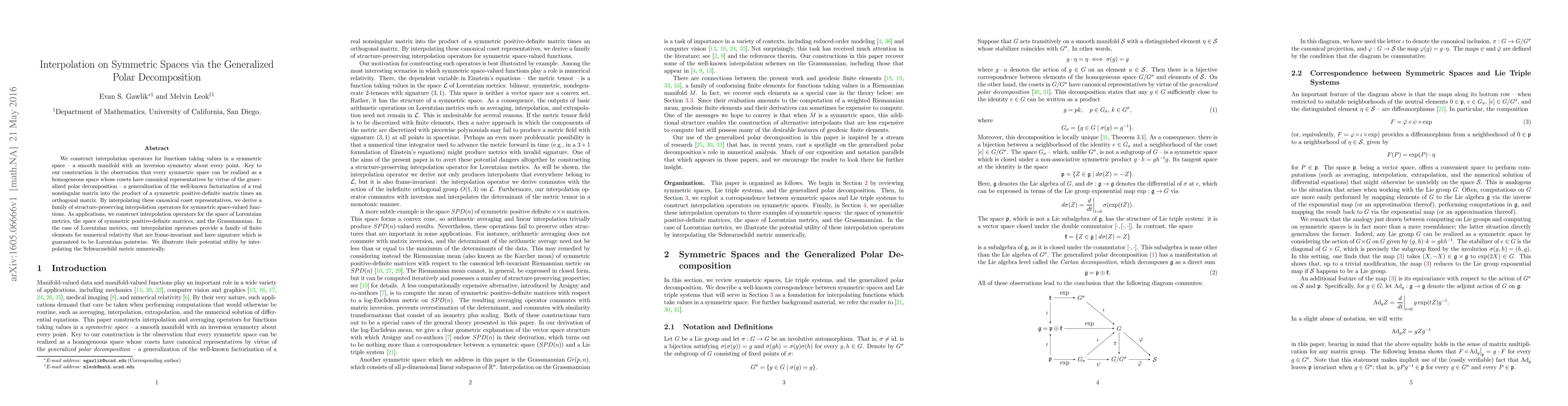 We construct interpolation operators for functions taking values in a symmetric space -- a smooth manifold with an inversion symmetry about every point. Key to our construction is the observation that every symmetric space can be realized as a homogeneous space whose cosets have canonical representatives by virtue of the generalized polar decomposition -- a generalization of the well-known factorization of a real nonsingular matrix into the product of a symmetric positive-definite matrix times an orthogonal matrix. By interpolating these canonical coset representatives, we derive a family of structure-preserving interpolation operators for symmetric space-valued functions. As applications, we construct interpolation operators for the space of Lorentzian metrics, the space of symmetric positive-definite matrices, and the Grassmannian. In the case of Lorentzian metrics, our interpolation operators provide a family of finite elements for numerical relativity that are frame-invariant and have signature which is guaranteed to be Lorentzian pointwise. We illustrate their potential utility by interpolating the Schwarzschild metric numerically.