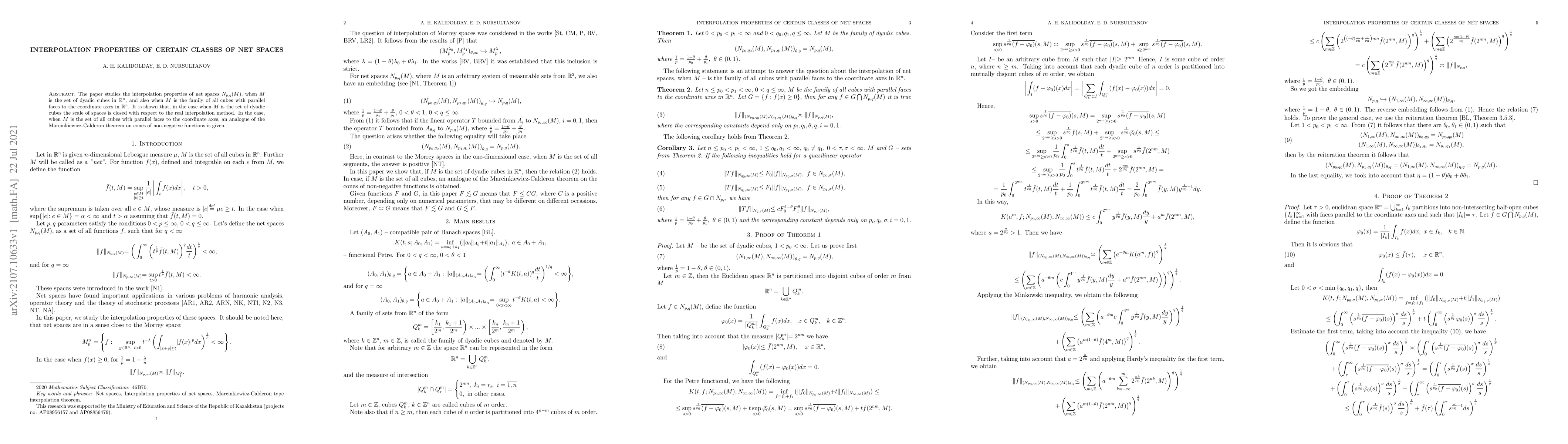 The paper studies the interpolation properties of net spaces $N_{p,q}(M)$, when $M$ is the set of dyadic cubes in $\mathbb{R}^n$, and also when $M$ is the family of all cubes with parallel faces to the coordinate axes in $\mathbb{R}^n$. It is shown that, in the case when $M$ is the set of dyadic cubes the scale of spaces is closed with respect to the real interpolation method. In the case, when $M$ is the set of all cubes with parallel faces to the coordinate axes, an analogue of the Marcinkiewicz-Calderon theorem on cones of non-negative functions is given.