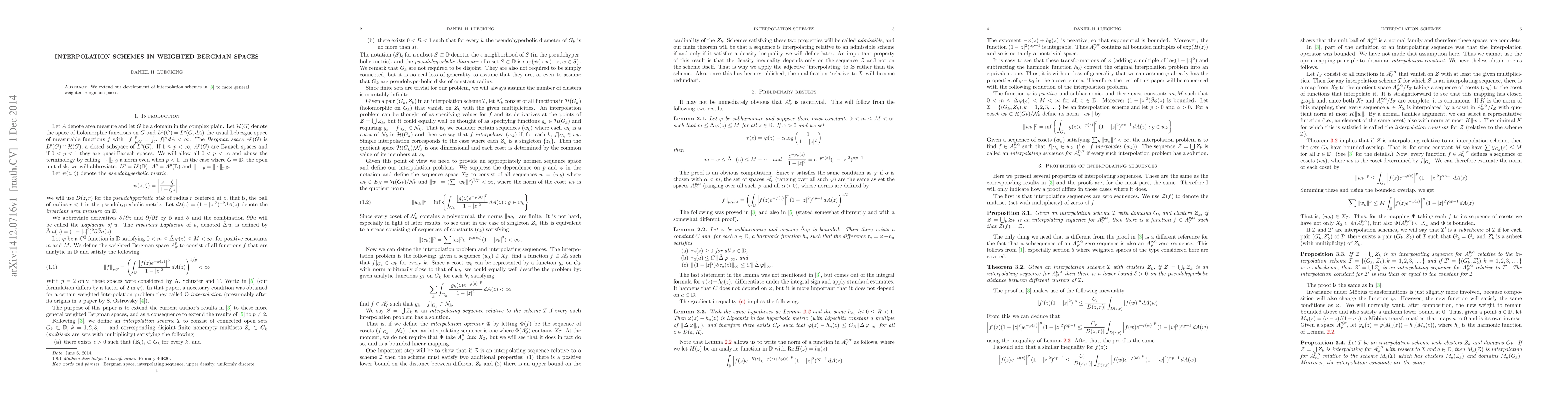 This paper extends interpolation schemes for weighted Bergman spaces to more general weights, enabling nonseparated interpolating sequences for a broader range of applications.
