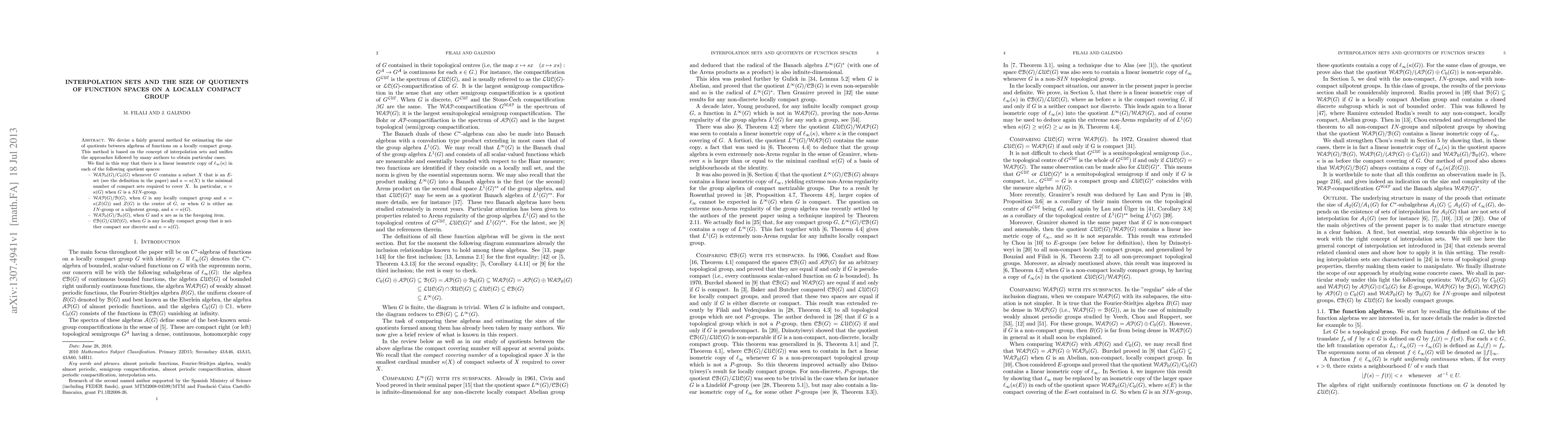 We devise a fairly general method for estimating the size of quotients between algebras of functions on a locally compact group. This method is based on the concept of interpolation sets and unifies the approaches followed by many authors to obtain particular cases. Among the applications we find, we obtain that the quotients WAP(G)/B(G) (G being a locally compact group in the class [IN] or a nilpotent locally compact group) and CB(G)/LUC(G) (G being any non-compact non-discrete locally compact group) contain a linearly isometric copy of \ell_\infty(\kappa(G)) where \kappa(G) is the compact covering number of G, and WAP(G), B(G) and LUC(G) refer, respectively, to the algebra of weakly almost periodic functions, the uniform closure of the Fourier-Stieltjes algebra and the bounded right uniformly continuous functions.