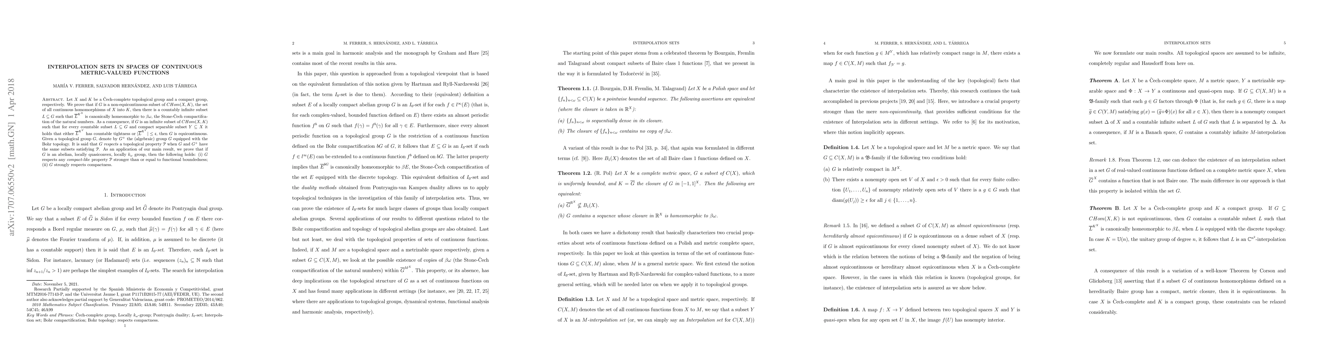 Let $X$ and $M$ be a topological space and metric space, respectively. If $C(X,M)$ denotes the set of all continuous functions from X to M, we say that a subset $Y$ of $X$ is an \emph{$M$-interpolation set} if given any function $g\in M^Y$ with relatively compact range in $M$, there exists a map $f\in C(X,M)$ such that $f_{|Y}=g$. In this paper, motivated by a result of Bourgain in \cite{Bourgain1977}, we introduce a property, stronger than the mere \emph{non equicontinuity} of a family of continuous functions, that isolates a crucial fact for the existence of interpolation sets in fairly general settings. As a consequence, we establish the existence of $I_0$ sets in every nonprecompact subset of a abelian locally $k_{\omega}$-groups. This implies that abelian locally $k_{\omega}$-groups strongly respects compactness.
