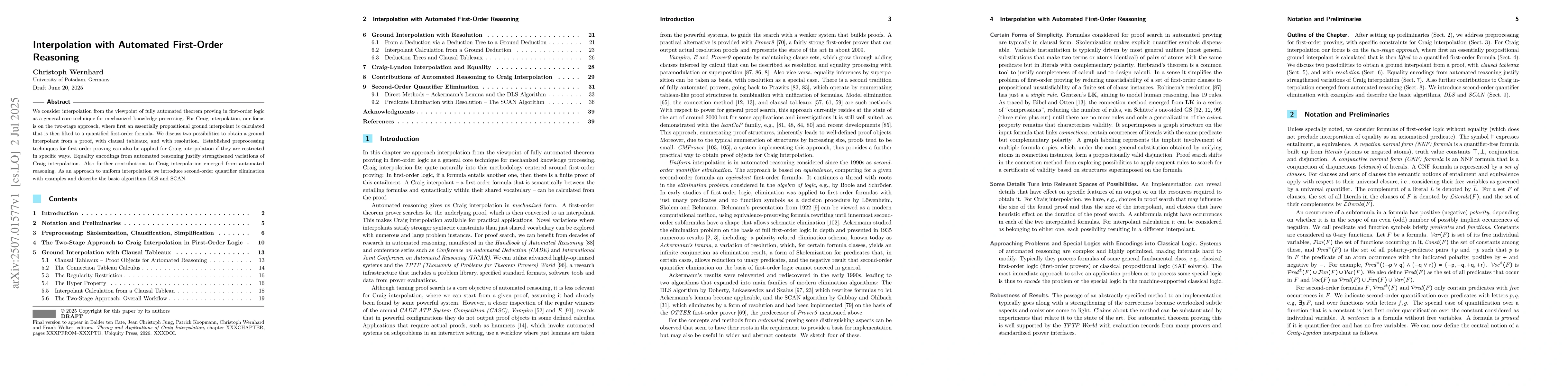 We consider interpolation from the viewpoint of fully automated theorem proving in first-order logic as a general core technique for mechanized knowledge processing. For Craig interpolation, our focus is on the two-stage approach, where first an essentially propositional ground interpolant is calculated that is then lifted to a quantified first-order formula. We discuss two possibilities to obtain a ground interpolant from a proof, with clausal tableaux, and with resolution. Established preprocessing techniques for first-order proving can also be applied for Craig interpolation if they are restricted in specific ways. Equality encodings from automated reasoning justify strengthened variations of Craig interpolation. Also further contributions to Craig interpolation emerged from automated reasoning. As an approach to uniform interpolation we introduce second-order quantifier elimination with examples and describe the basic algorithms DLS and SCAN.