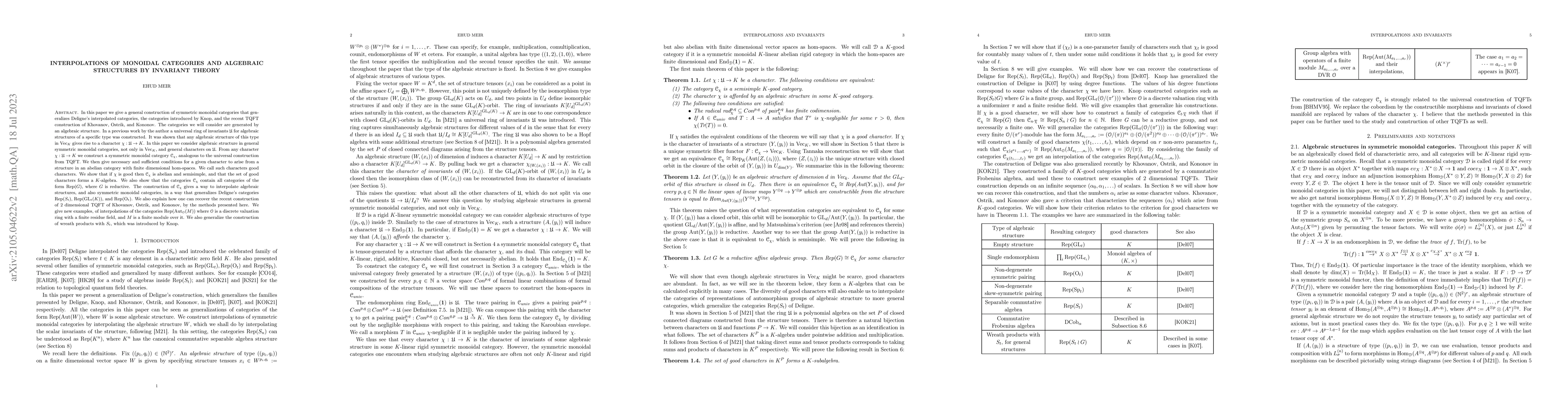 In a previous work by the author it was shown that every finite dimensional algebraic structure over an algebraically closed field of characteristic zero K gives rise to a character $K[X]_{aug}\to K$, where $K[X]_aug$ is a commutative Hopf algebra that encodes scalar invariants of structures. This enabled us to think of some characters $K[X]_{aug}\to K$ as algebraic structures with closed orbit. In this paper we study structures in general symmetric monoidal categories, and not only in $Vec_K$. We show that every character $\chi : K[X]_{aug}\to K$ arises from such a structure, by constructing a category $C_{\chi}$ that is analogous to the universal construction from TQFT. We then give necessary and sufficient conditions for a given character to arise from a structure in an abelian category with finite dimensional hom-spaces. We call such characters good characters. We show that if $\chi$ is good then $C_{\chi}$ is abelian and semisimple, and that the set of good characters forms a K-algebra. This gives us a way to interpolate algebraic structures, and also symmetric monoidal categories, in a way that generalizes Deligne's categories $Rep(S_t)$, $Rep(GL_t(K))$, $Rep(O_t)$, and also some of the symmetric monoidal categories introduced by Knop. We also explain how one can recover the recent construction of 2 dimensional TQFT of Khovanov, Ostrik, and Kononov, by the methods presented here. We give new examples, of interpolations of the categories $Rep(Aut_{O}(M))$ where $O$ is a discrete valuation ring with a finite residue field, and M is a finite module over it. We also generalize the construction of wreath products with $S_t$, which was introduced by Knop.