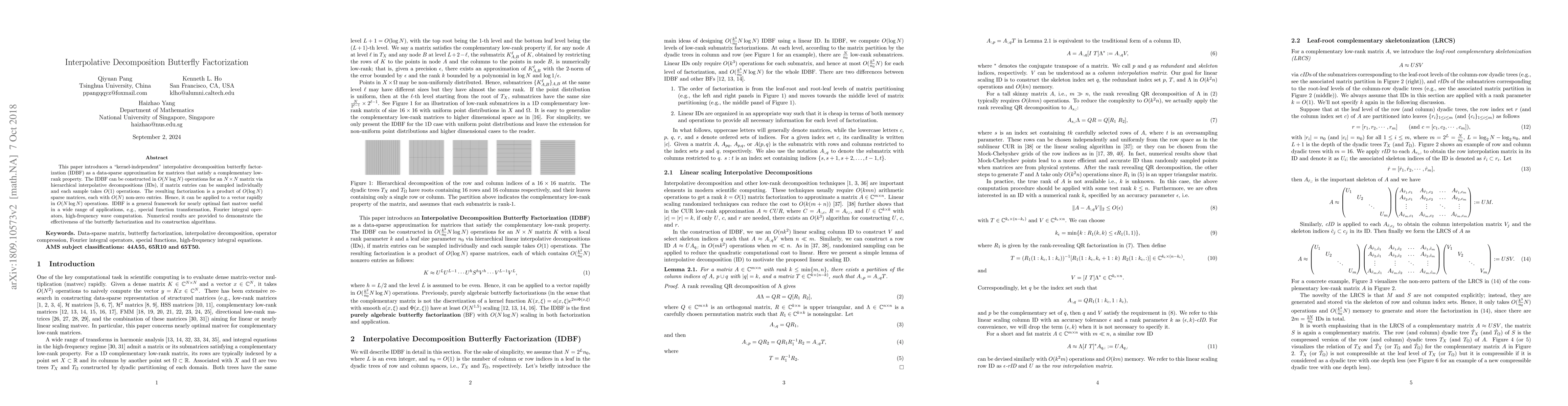 This paper presents an "interpolative decomposition butterfly factorization" (IDBF) for efficiently approximating matrices with complementary low-rank properties. The method constructs a factorization in $O(N\log N)$ operations, yielding a product of $O(\log N)$ sparse matrices, enabling rapid vector multiplication in $O(N\log N)$ operations, with applications in various computational fields.