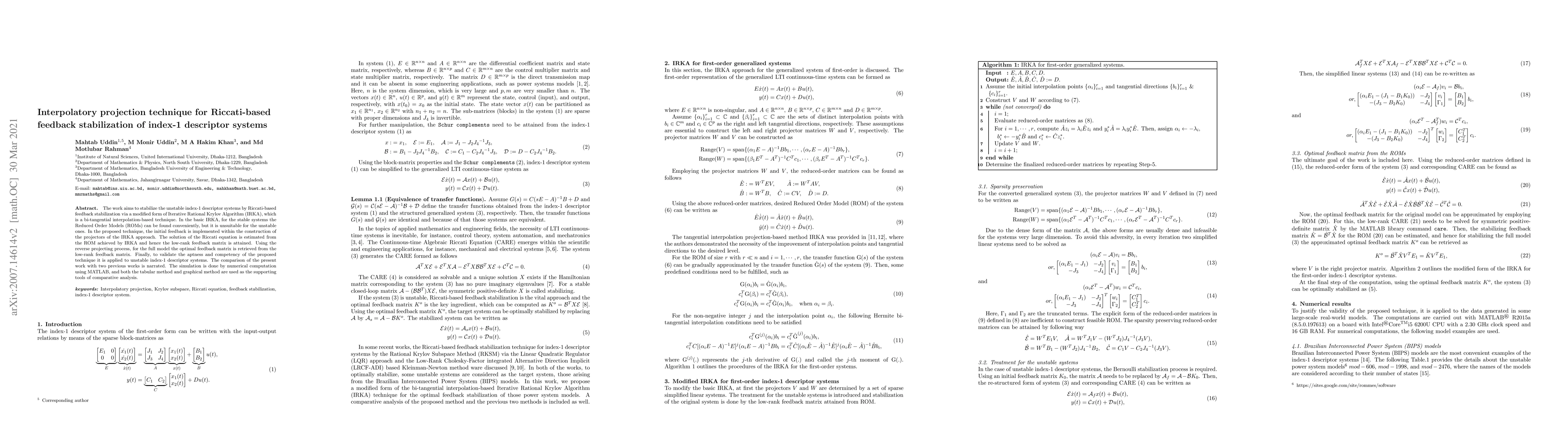 The work aims to stabilize the unstable index-1 descriptor systems by Riccati-based feedback stabilization via a modified form of Iterative Rational Krylov Algorithm (IRKA), which is a bi-tangential interpolation-based technique. In the basic IRKA, for the stable systems the Reduced Order Models (ROMs) can be found conveniently, but it is unsuitable for the unstable ones. In the proposed technique, the initial feedback is implemented within the construction of the projectors of the IRKA approach. The solution of the Riccati equation is estimated from the ROM achieved by IRKA and hence the low-rank feedback matrix is attained. Using the reverse projecting process, for the full model the optimal feedback matrix is retrieved from the low-rank feedback matrix. Finally, to validate the aptness and competency of the proposed technique it is applied to unstable index-1 descriptor systems. The comparison of the present work with two previous works is narrated. The simulation is done by numerical computation using MATLAB, and both the tabular method and graphical method are used as the supporting tools of comparative analysis.