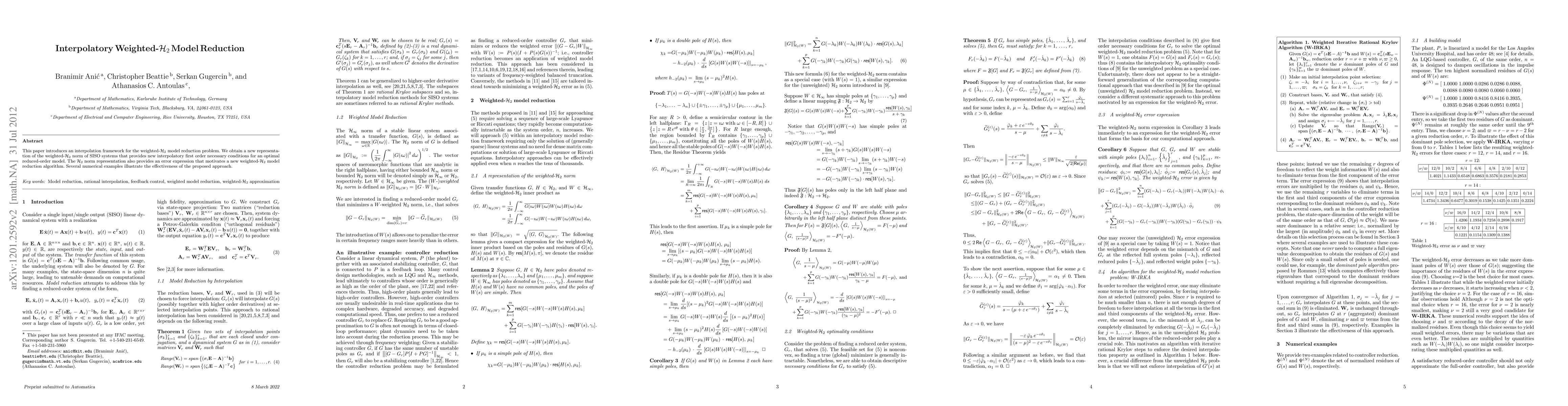 This paper introduces an interpolation framework for the weighted-H2 model reduction problem. We obtain a new representation of the weighted-H2 norm of SISO systems that provides new interpolatory first order necessary conditions for an optimal reduced-order model. The H2 norm representation also provides an error expression that motivates a new weighted-H2 model reduction algorithm. Several numerical examples illustrate the effectiveness of the proposed approach.