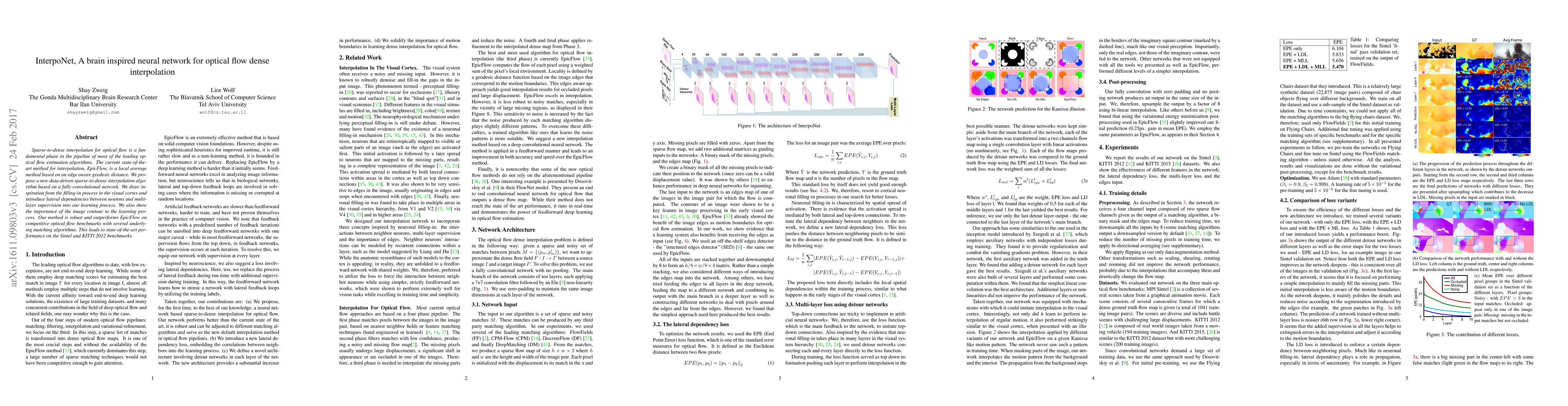 The paper proposes InterpoNet, a brain-inspired neural network for dense optical flow interpolation, which outperforms the current state-of-the-art method, EpicFlow, by leveraging lateral neuron dependencies and multi-layer supervision, achieving top results on Sintel and KITTI 2012 benchmarks.