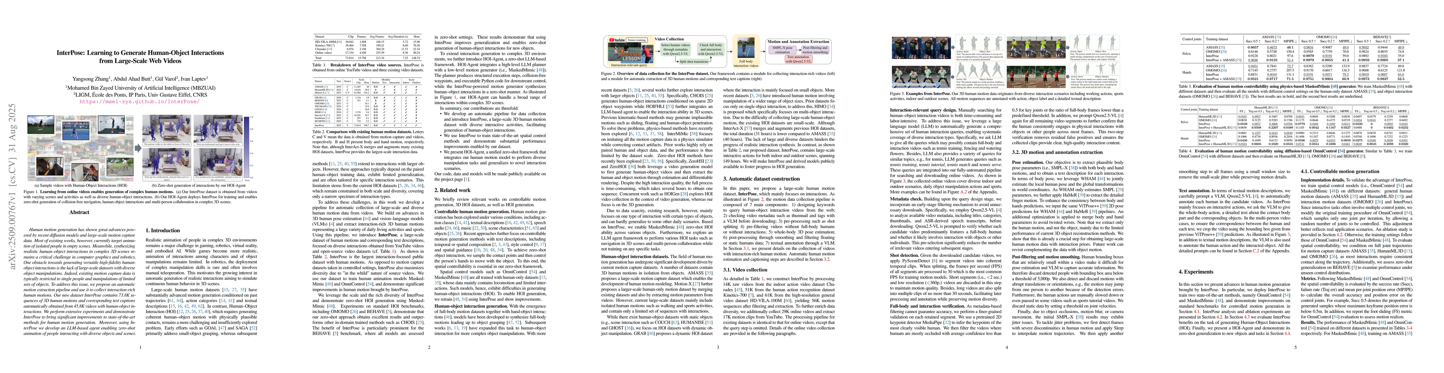Human motion generation has shown great advances thanks to the recent diffusion models trained on large-scale motion capture data. Most of existing works, however, currently target animation of isolated people in empty scenes. Meanwhile, synthesizing realistic human-object interactions in complex 3D scenes remains a critical challenge in computer graphics and robotics. One obstacle towards generating versatile high-fidelity human-object interactions is the lack of large-scale datasets with diverse object manipulations. Indeed, existing motion capture data is typically restricted to single people and manipulations of limited sets of objects. To address this issue, we propose an automatic motion extraction pipeline and use it to collect interaction-rich human motions. Our new dataset InterPose contains 73.8K sequences of 3D human motions and corresponding text captions automatically obtained from 45.8K videos with human-object interactions. We perform extensive experiments and demonstrate InterPose to bring significant improvements to state-of-the-art methods for human motion generation. Moreover, using InterPose we develop an LLM-based agent enabling zero-shot animation of people interacting with diverse objects and scenes.