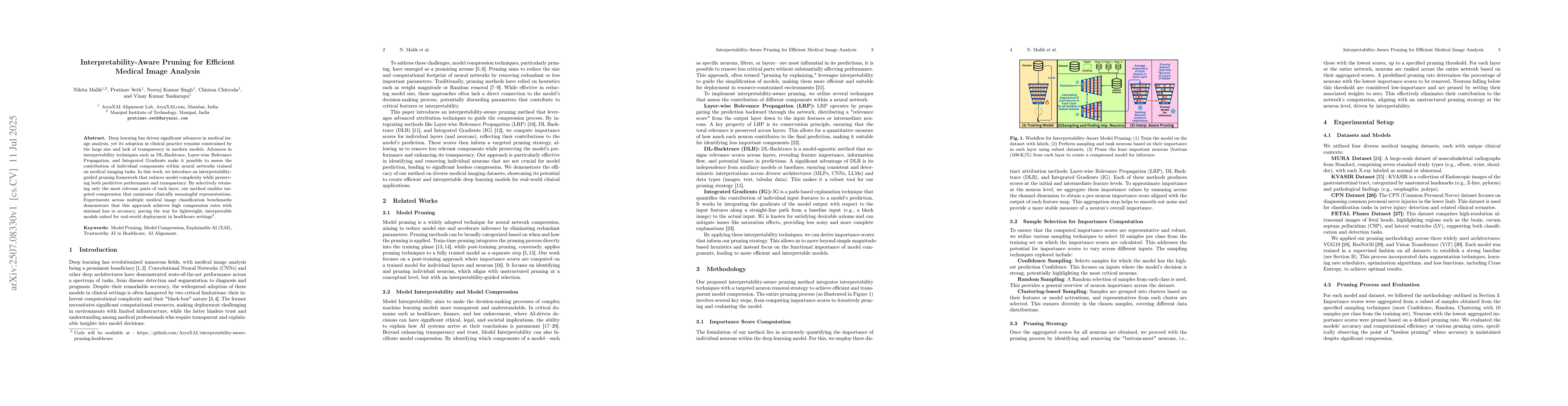 Deep learning has driven significant advances in medical image analysis, yet its adoption in clinical practice remains constrained by the large size and lack of transparency in modern models. Advances in interpretability techniques such as DL-Backtrace, Layer-wise Relevance Propagation, and Integrated Gradients make it possible to assess the contribution of individual components within neural networks trained on medical imaging tasks. In this work, we introduce an interpretability-guided pruning framework that reduces model complexity while preserving both predictive performance and transparency. By selectively retaining only the most relevant parts of each layer, our method enables targeted compression that maintains clinically meaningful representations. Experiments across multiple medical image classification benchmarks demonstrate that this approach achieves high compression rates with minimal loss in accuracy, paving the way for lightweight, interpretable models suited for real-world deployment in healthcare settings.