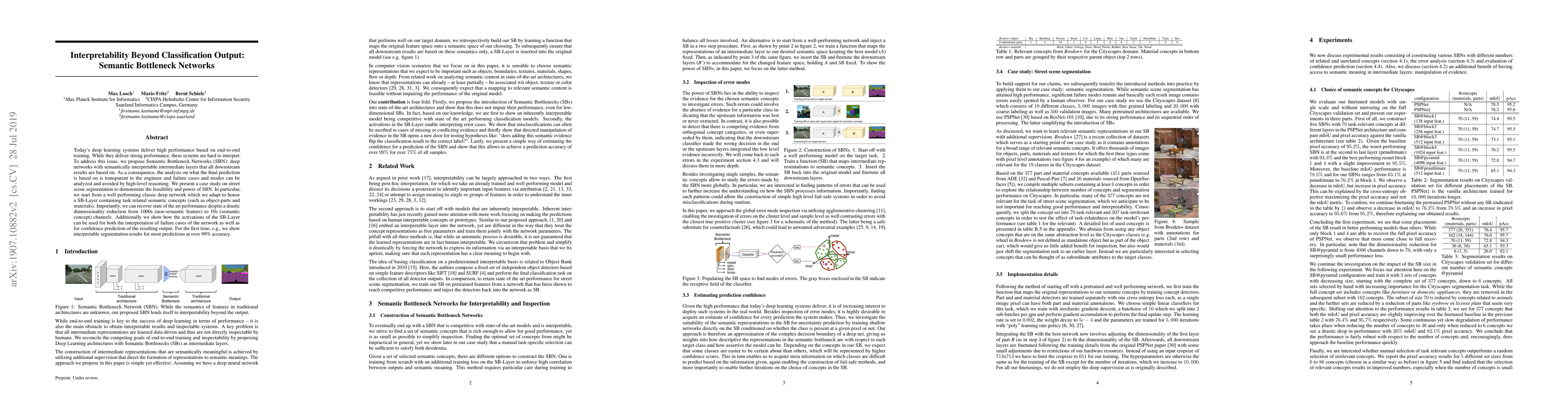 Today's deep learning systems deliver high performance based on end-to-end training. While they deliver strong performance, these systems are hard to interpret. To address this issue, we propose Semantic Bottleneck Networks (SBN): deep networks with semantically interpretable intermediate layers that all downstream results are based on. As a consequence, the analysis on what the final prediction is based on is transparent to the engineer and failure cases and modes can be analyzed and avoided by high-level reasoning. We present a case study on street scene segmentation to demonstrate the feasibility and power of SBN. In particular, we start from a well performing classic deep network which we adapt to house a SB-Layer containing task related semantic concepts (such as object-parts and materials). Importantly, we can recover state of the art performance despite a drastic dimensionality reduction from 1000s (non-semantic feature) to 10s (semantic concept) channels. Additionally we show how the activations of the SB-Layer can be used for both the interpretation of failure cases of the network as well as for confidence prediction of the resulting output. For the first time, e.g., we show interpretable segmentation results for most predictions at over 99% accuracy.