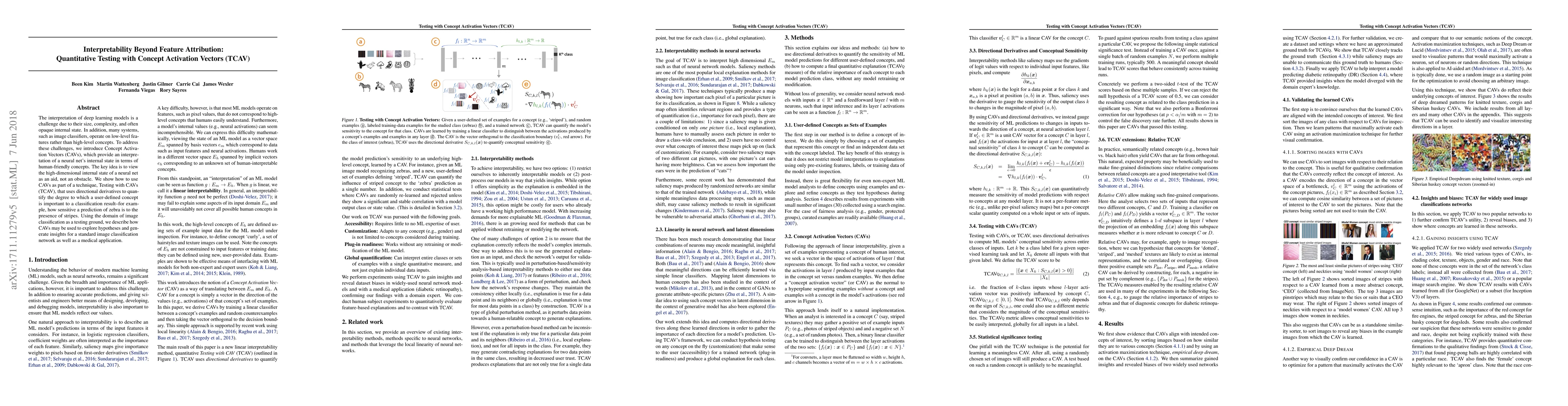 Researchers introduce Concept Activation Vectors (CAVs) to interpret deep learning models in terms of human-friendly concepts, enabling the quantification of concept importance in image classification.