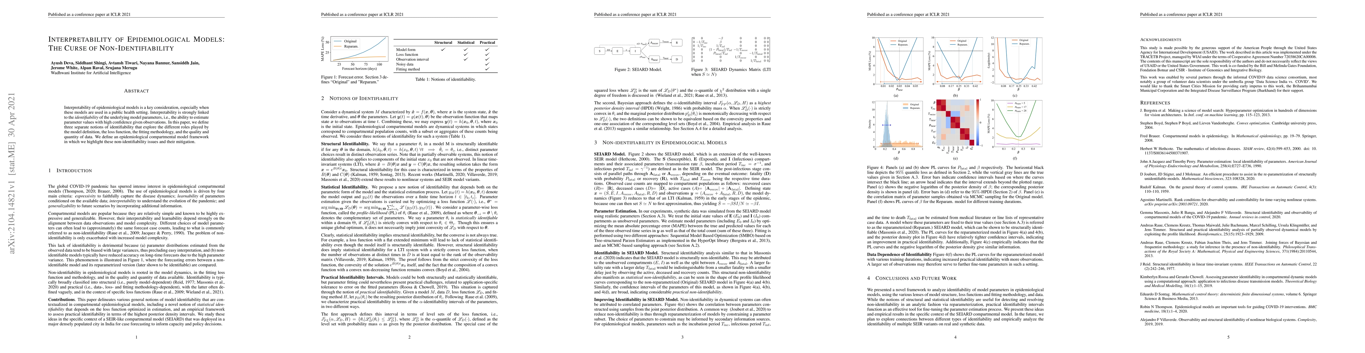 This paper explores the non-identifiability issues of epidemiological models, which can hinder their interpretability in public health settings. It defines three notions of identifiability and proposes mitigation strategies to improve model accuracy and confidence.