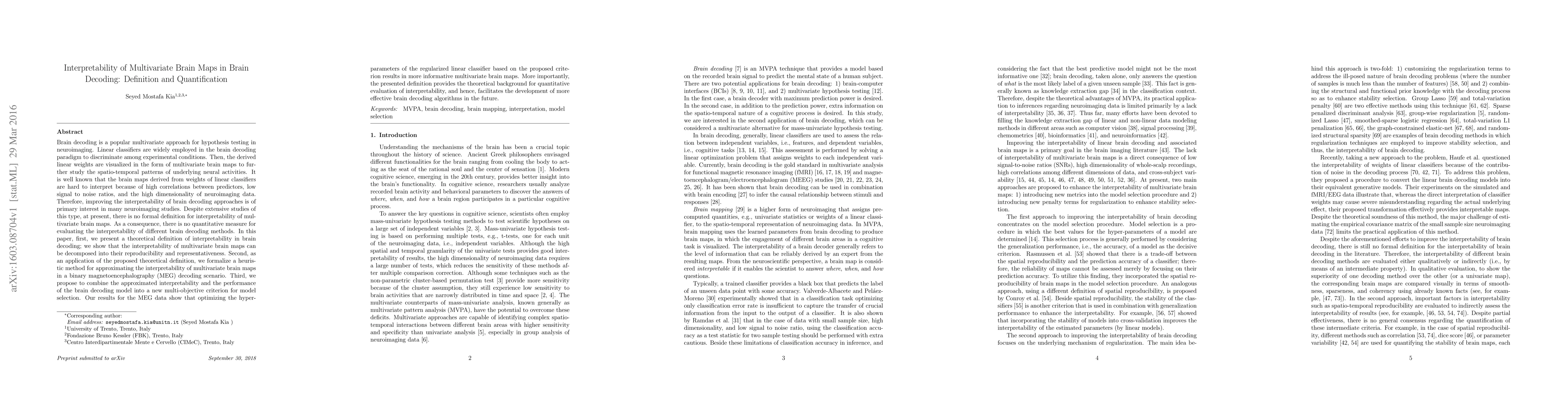 This paper introduces a theoretical definition for the interpretability of multivariate brain maps in brain decoding, decomposing it into reproducibility and representativeness. It proposes a heuristic method to quantify interpretability in MEG decoding scenarios and suggests a multi-objective criterion for model selection that optimizes both interpretability and performance, leading to more informative brain maps.
