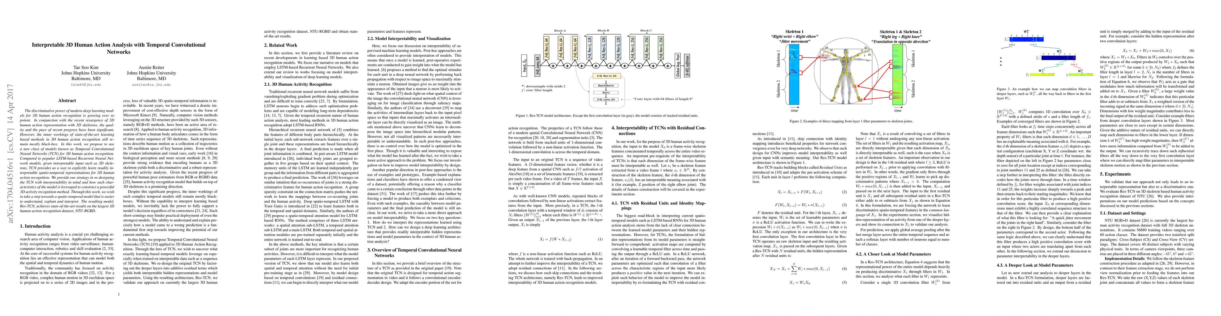 This paper proposes using Temporal Convolutional Neural Networks (TCN) for 3D human action recognition, aiming to create interpretable models that can explain their decision-making process. The developed Res-TCN model achieves state-of-the-art performance on the NTU-RGBD dataset, demonstrating the effectiveness of TCNs for this task.