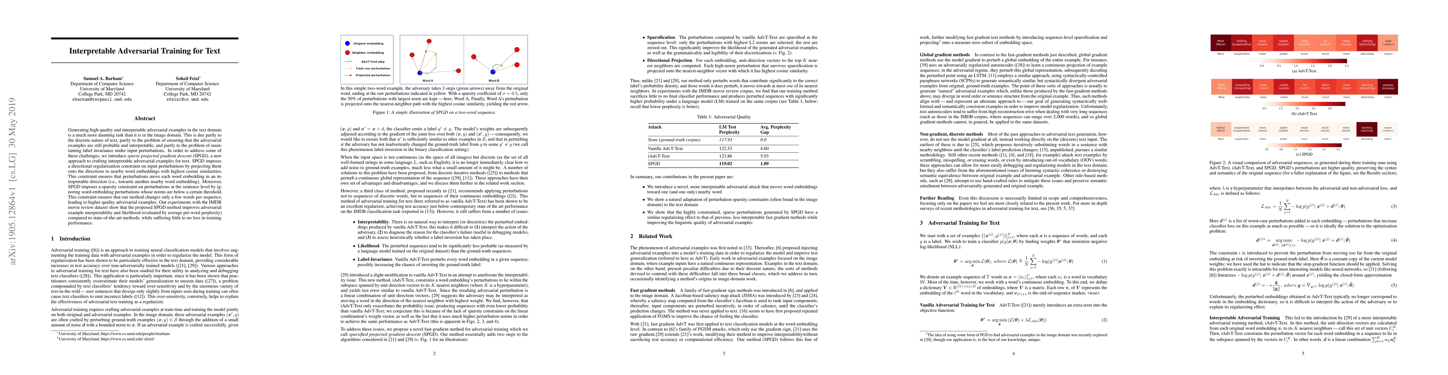 The paper introduces sparse projected gradient descent (SPGD) to generate interpretable adversarial examples for text, ensuring perturbations are in meaningful directions and affect only a few words. Experiments on the IMDB dataset show SPGD improves interpretability and likelihood compared to existing methods without significant loss in training performance.