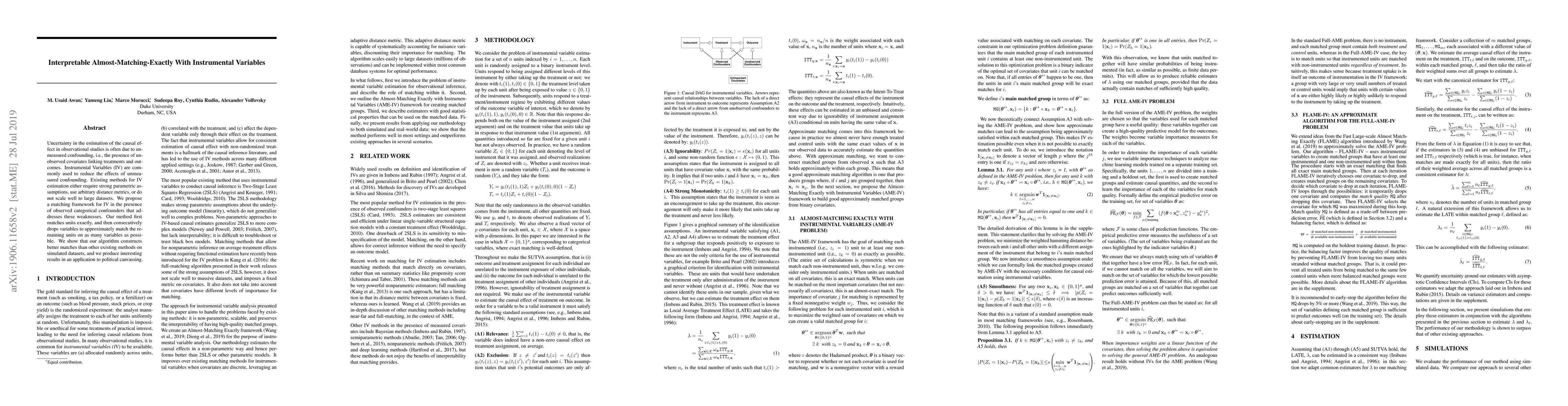 This paper proposes a novel matching framework for Instrumental Variables (IV) estimation that addresses limitations of existing methods by reducing unmeasured confounding through exact matching followed by almost-exact matching, demonstrating improved performance on simulated datasets and in a political canvassing application.
