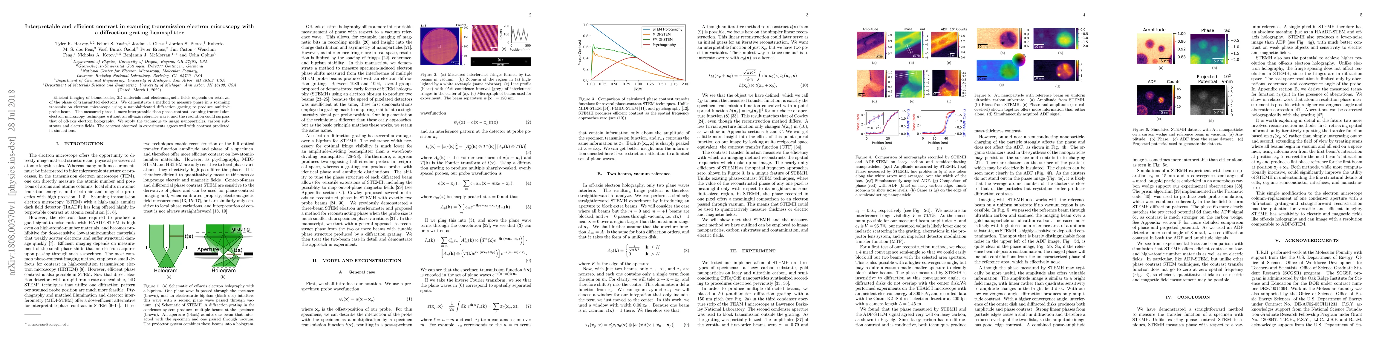 This paper presents a novel method using a diffraction grating beamsplitter in scanning transmission electron microscopy to measure electron phase, offering interpretable contrast without an off-axis reference wave and potentially higher resolution than traditional holography. The method is demonstrated through imaging nanoparticles, carbon substrates, and electric fields, with experimental results aligning well with simulations.