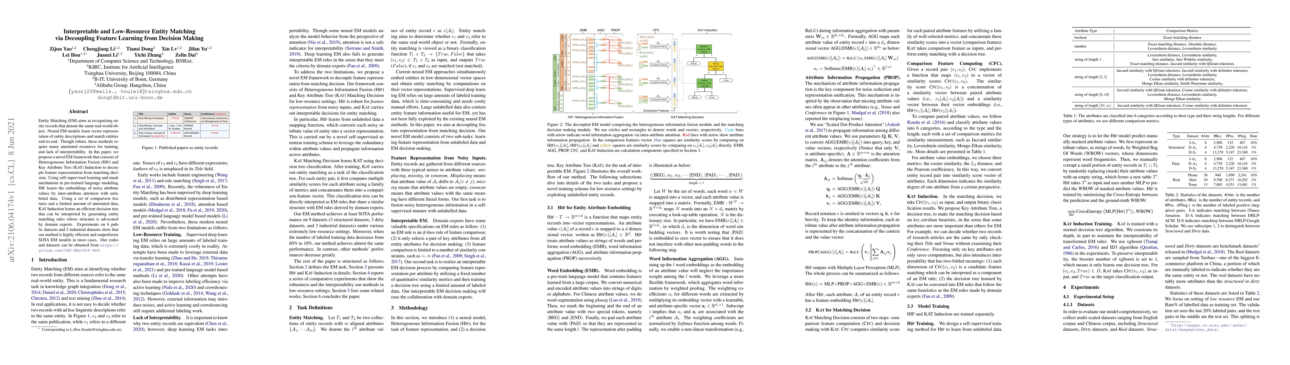 This paper introduces an interpretable and low-resource Entity Matching framework that uses Heterogeneous Information Fusion and Key Attribute Tree Induction to decouple feature learning from decision making. It leverages self-supervised learning and pre-trained language models for efficient representation, and a decision tree for interpretable matching rules.