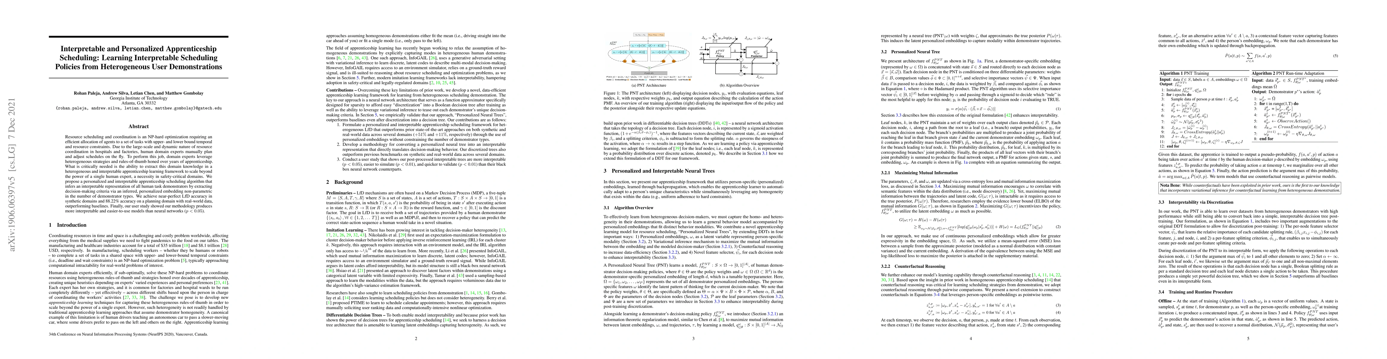 This paper proposes an interpretable and personalized apprenticeship scheduling algorithm that learns from heterogeneous user demonstrations to optimize resource allocation in dynamic environments like hospitals and factories. The method achieves high accuracy and outperforms baselines, while also producing more interpretable models compared to neural networks.