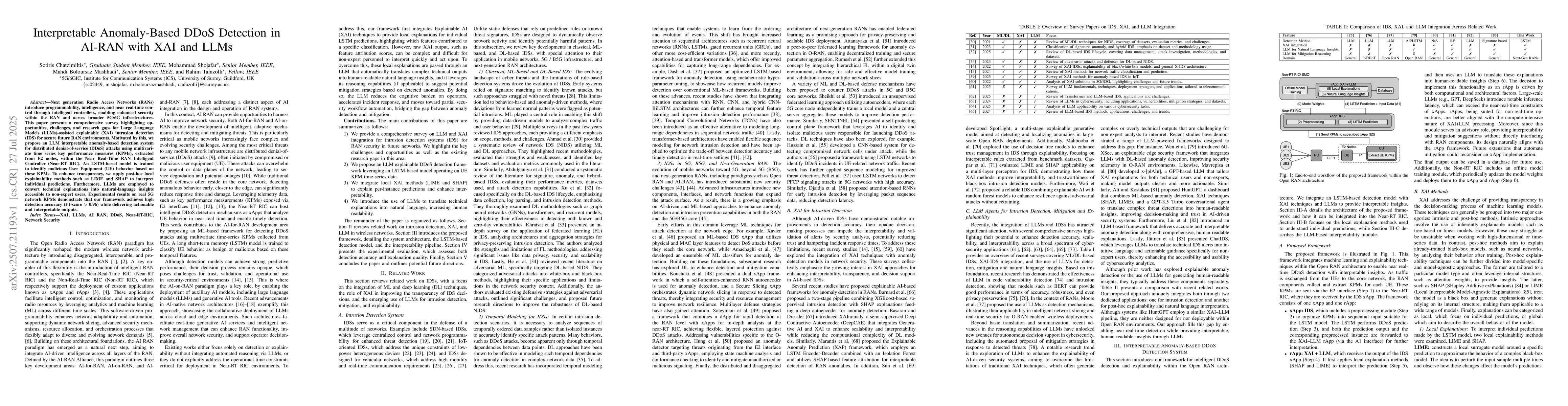 The paper presents an LLM interpretable anomaly-based DDoS detection system for AI-RAN environments using LSTM models, XAI techniques, and LLMs for natural language insights.