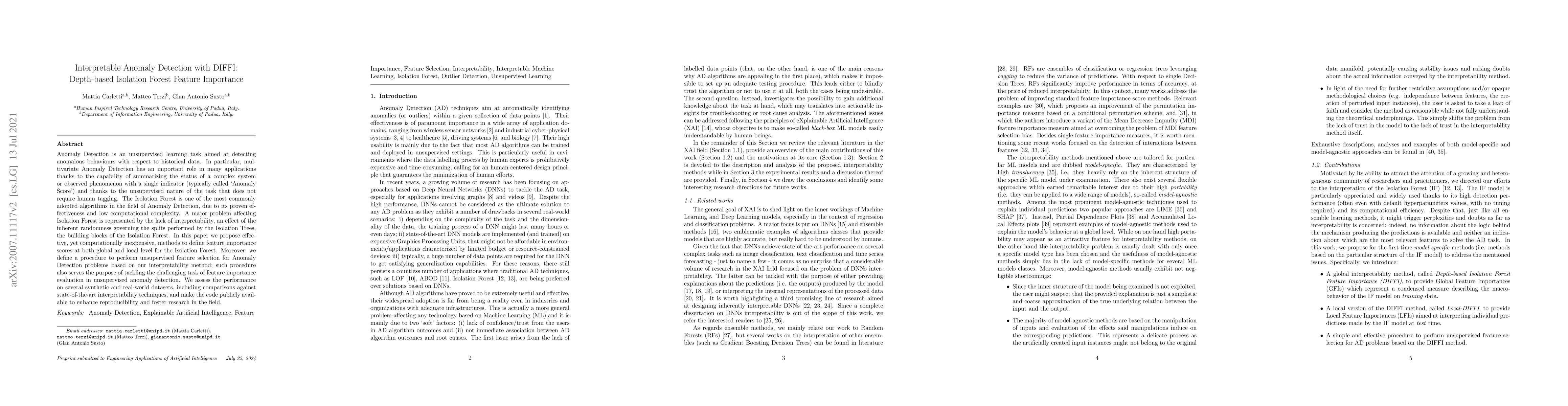 This paper introduces DIFFI, a depth-based Isolation Forest with interpretability, offering both global and local feature importance scores to enhance anomaly detection. It also proposes an unsupervised feature selection method, evaluated on various datasets, to address interpretability challenges in anomaly detection.