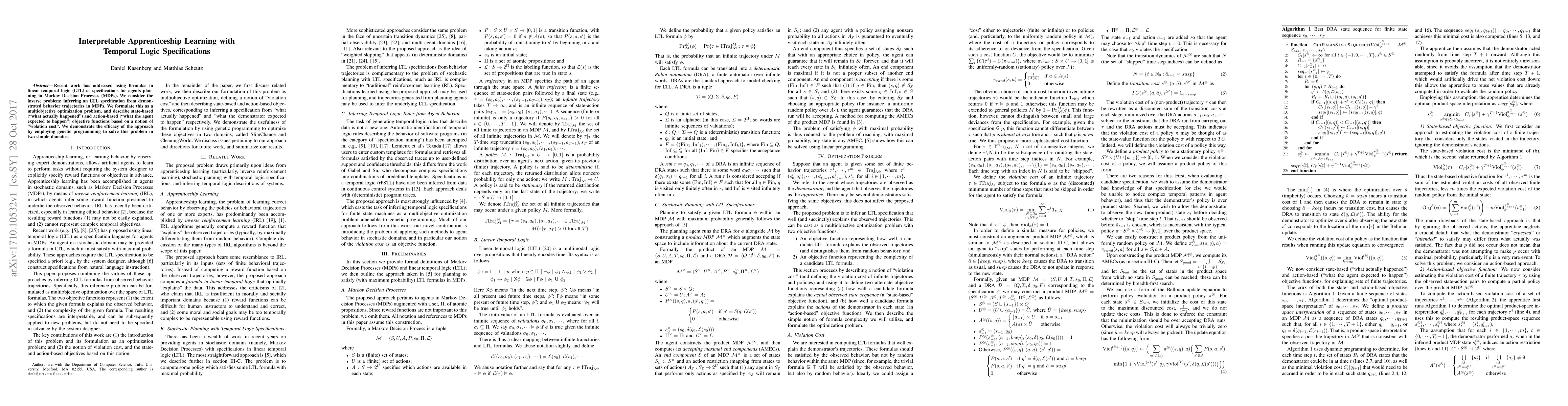 Recent work has addressed using formulas in linear temporal logic (LTL) as specifications for agents planning in Markov Decision Processes (MDPs). We consider the inverse problem: inferring an LTL specification from demonstrated behavior trajectories in MDPs. We formulate this as a multiobjective optimization problem, and describe state-based ("what actually happened") and action-based ("what the agent expected to happen") objective functions based on a notion of "violation cost". We demonstrate the efficacy of the approach by employing genetic programming to solve this problem in two simple domains.
