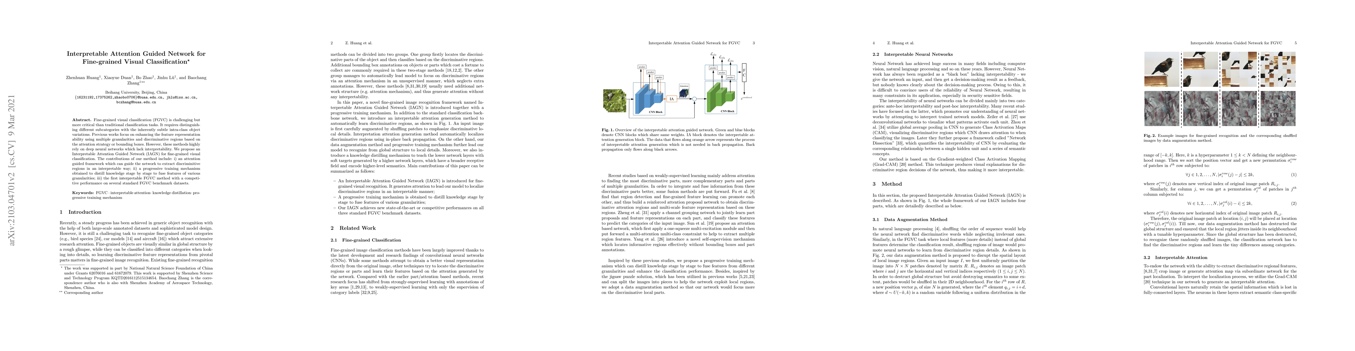 The paper proposes an Interpretable Attention Guided Network (IAGN) for fine-grained visual classification, featuring an attention-guided framework to extract discriminative regions interpretably and a progressive training mechanism to distill knowledge for multi-granularity feature fusion, achieving competitive performance on standard benchmarks.