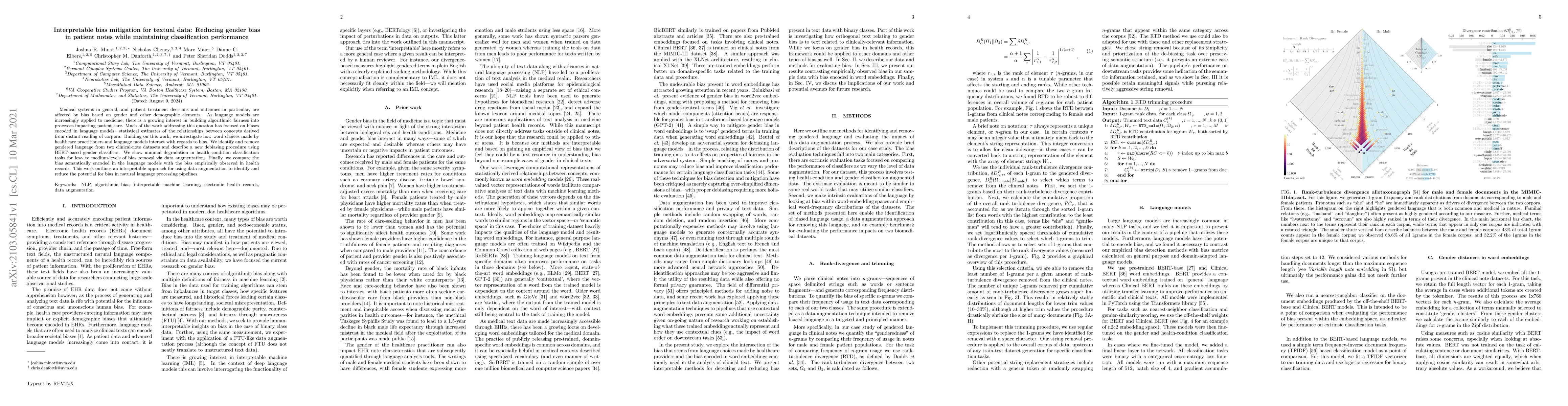Medical systems in general, and patient treatment decisions and outcomes in particular, are affected by bias based on gender and other demographic elements. As language models are increasingly applied to medicine, there is a growing interest in building algorithmic fairness into processes impacting patient care. Much of the work addressing this question has focused on biases encoded in language models -- statistical estimates of the relationships between concepts derived from distant reading of corpora. Building on this work, we investigate how word choices made by healthcare practitioners and language models interact with regards to bias. We identify and remove gendered language from two clinical-note datasets and describe a new debiasing procedure using BERT-based gender classifiers. We show minimal degradation in health condition classification tasks for low- to medium-levels of bias removal via data augmentation. Finally, we compare the bias semantically encoded in the language models with the bias empirically observed in health records. This work outlines an interpretable approach for using data augmentation to identify and reduce the potential for bias in natural language processing pipelines.