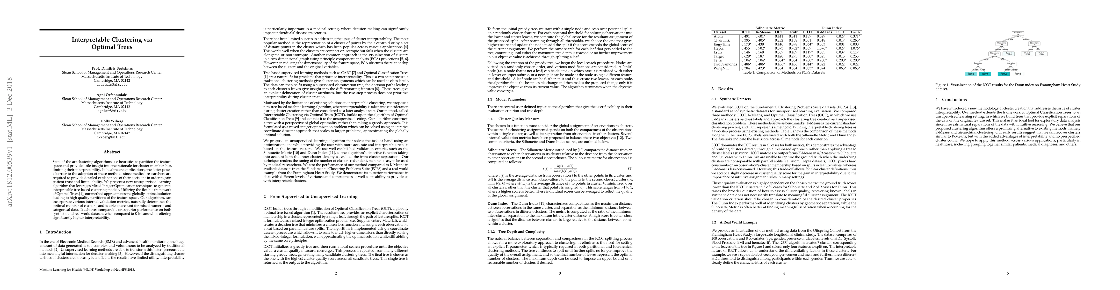 This paper presents a new clustering algorithm that uses Mixed Integer Optimization to generate tree-based models with high interpretability, outperforming K-Means on synthetic and real-world datasets.