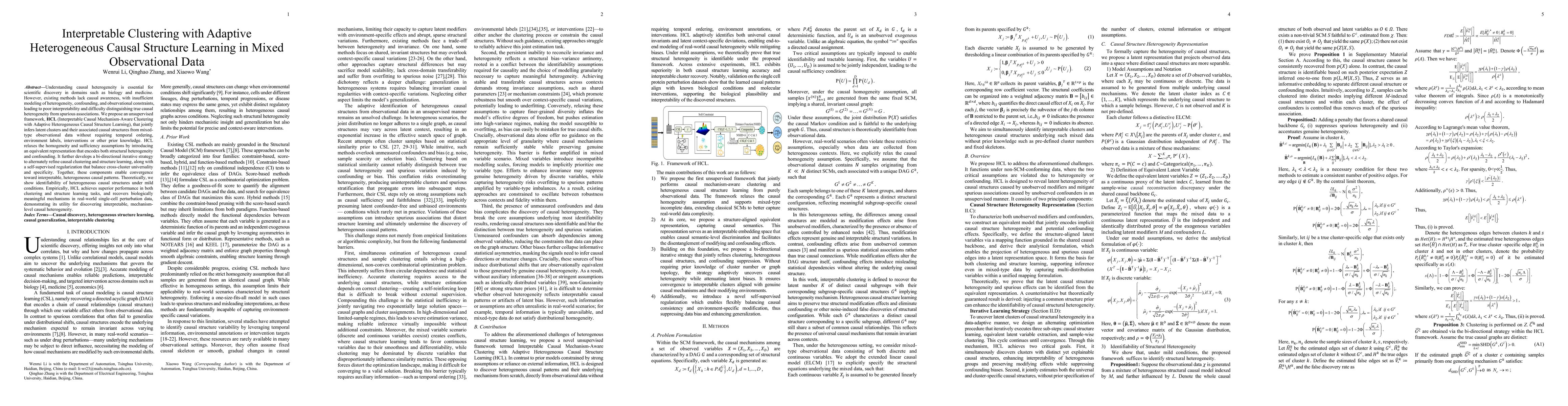 Understanding causal heterogeneity is essential for scientific discovery in domains such as biology and medicine. However, existing methods lack causal awareness, with insufficient modeling of heterogeneity, confounding, and observational constraints, leading to poor interpretability and difficulty distinguishing true causal heterogeneity from spurious associations. We propose an unsupervised framework, HCL (Interpretable Causal Mechanism-Aware Clustering with Adaptive Heterogeneous Causal Structure Learning), that jointly infers latent clusters and their associated causal structures from mixed-type observational data without requiring temporal ordering, environment labels, interventions or other prior knowledge. HCL relaxes the homogeneity and sufficiency assumptions by introducing an equivalent representation that encodes both structural heterogeneity and confounding. It further develops a bi-directional iterative strategy to alternately refine causal clustering and structure learning, along with a self-supervised regularization that balance cross-cluster universality and specificity. Together, these components enable convergence toward interpretable, heterogeneous causal patterns. Theoretically, we show identifiability of heterogeneous causal structures under mild conditions. Empirically, HCL achieves superior performance in both clustering and structure learning tasks, and recovers biologically meaningful mechanisms in real-world single-cell perturbation data, demonstrating its utility for discovering interpretable, mechanism-level causal heterogeneity.
