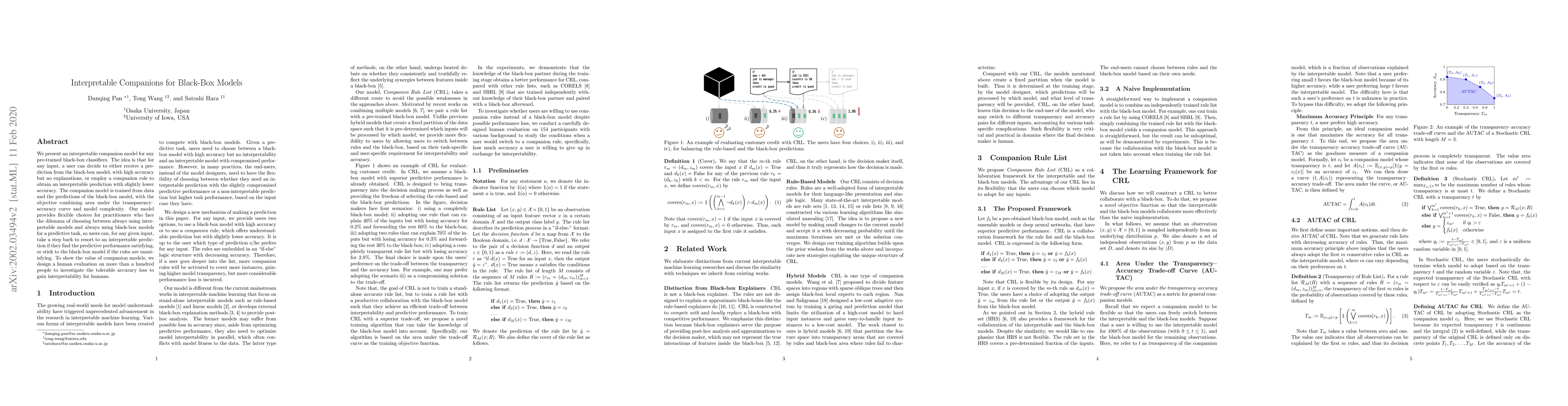 We present an interpretable companion model for any pre-trained black-box classifiers. The idea is that for any input, a user can decide to either receive a prediction from the black-box model, with high accuracy but no explanations, or employ a companion rule to obtain an interpretable prediction with slightly lower accuracy. The companion model is trained from data and the predictions of the black-box model, with the objective combining area under the transparency--accuracy curve and model complexity. Our model provides flexible choices for practitioners who face the dilemma of choosing between always using interpretable models and always using black-box models for a predictive task, so users can, for any given input, take a step back to resort to an interpretable prediction if they find the predictive performance satisfying, or stick to the black-box model if the rules are unsatisfying. To show the value of companion models, we design a human evaluation on more than a hundred people to investigate the tolerable accuracy loss to gain interpretability for humans.