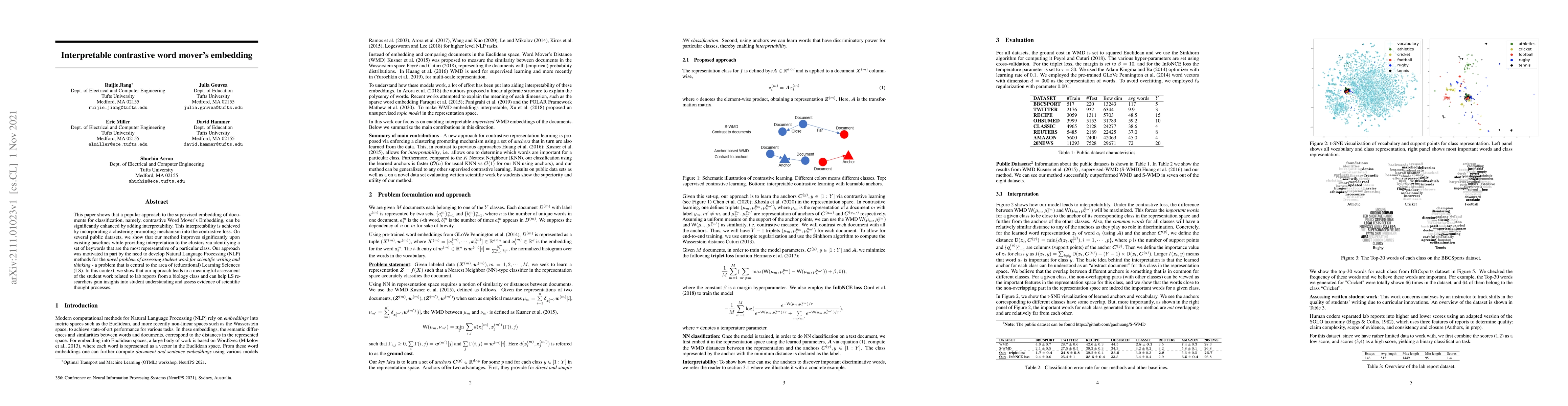 This paper shows that a popular approach to the supervised embedding of documents for classification, namely, contrastive Word Mover's Embedding, can be significantly enhanced by adding interpretability. This interpretability is achieved by incorporating a clustering promoting mechanism into the contrastive loss. On several public datasets, we show that our method improves significantly upon existing baselines while providing interpretation to the clusters via identifying a set of keywords that are the most representative of a particular class. Our approach was motivated in part by the need to develop Natural Language Processing (NLP) methods for the \textit{novel problem of assessing student work for scientific writing and thinking} - a problem that is central to the area of (educational) Learning Sciences (LS). In this context, we show that our approach leads to a meaningful assessment of the student work related to lab reports from a biology class and can help LS researchers gain insights into student understanding and assess evidence of scientific thought processes.