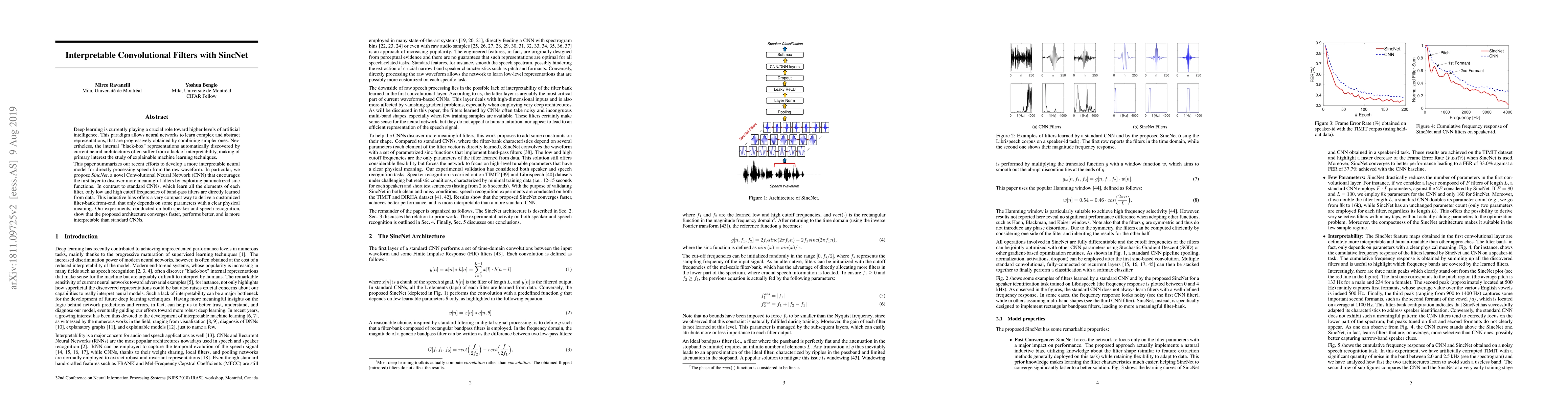 This paper introduces SincNet, an innovative Convolutional Neural Network designed to enhance interpretability in neural models for speech processing. Unlike traditional CNNs, SincNet leverages parametrized sinc functions to learn meaningful filters, focusing on low and high cutoff frequencies, thus providing a more transparent and efficient filter-bank front-end. Experimental results indicate that SincNet converges faster, performs better, and offers greater interpretability compared to standard CNNs.